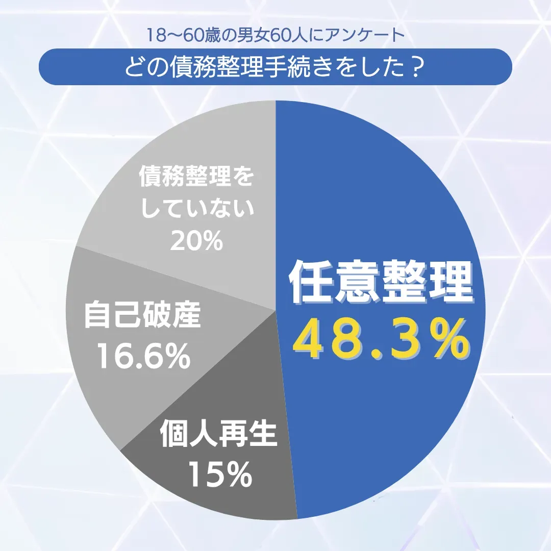 gooランキング編集部で債務整理経験のある男女60名にアンケートを実施したところ、最も多く選ばれていた手続きが任意整理でした。