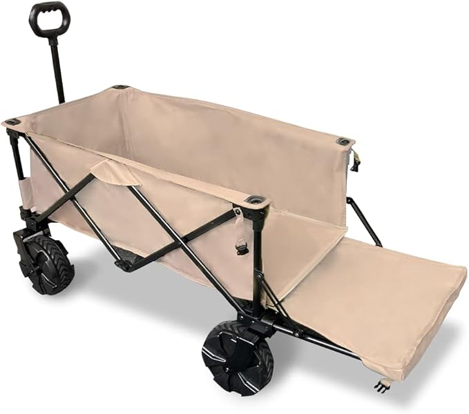 タイヤは直径17cm、幅10cmで大型のため砂浜のようなタイヤが埋もれやすい場所でも走行できます。別売りのミニタイプとの連結も可能で、拡張性の高いアウトドアワゴンです。