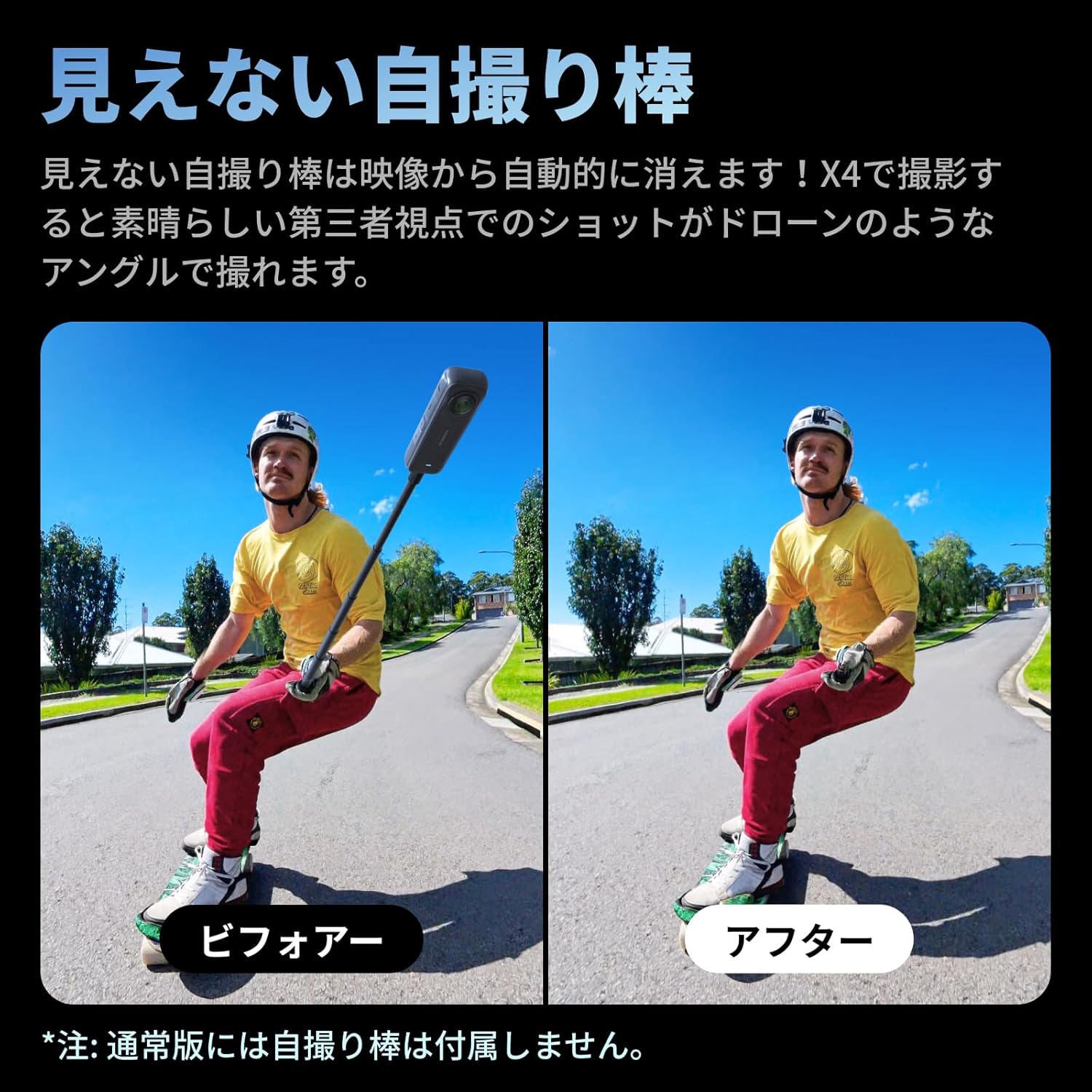 360度カメラの必須アイテムとも言えるのが「見えない自撮り棒」です。カメラの真下に配置することで、2つのレンズの映像を合成(スティッチ)する際に、棒が映像から自動的に消える仕組みになっています。これにより、まるでドローンや専属カメラマンが撮影したかのような、不思議で臨場感のある映像を簡単に撮ることができます。