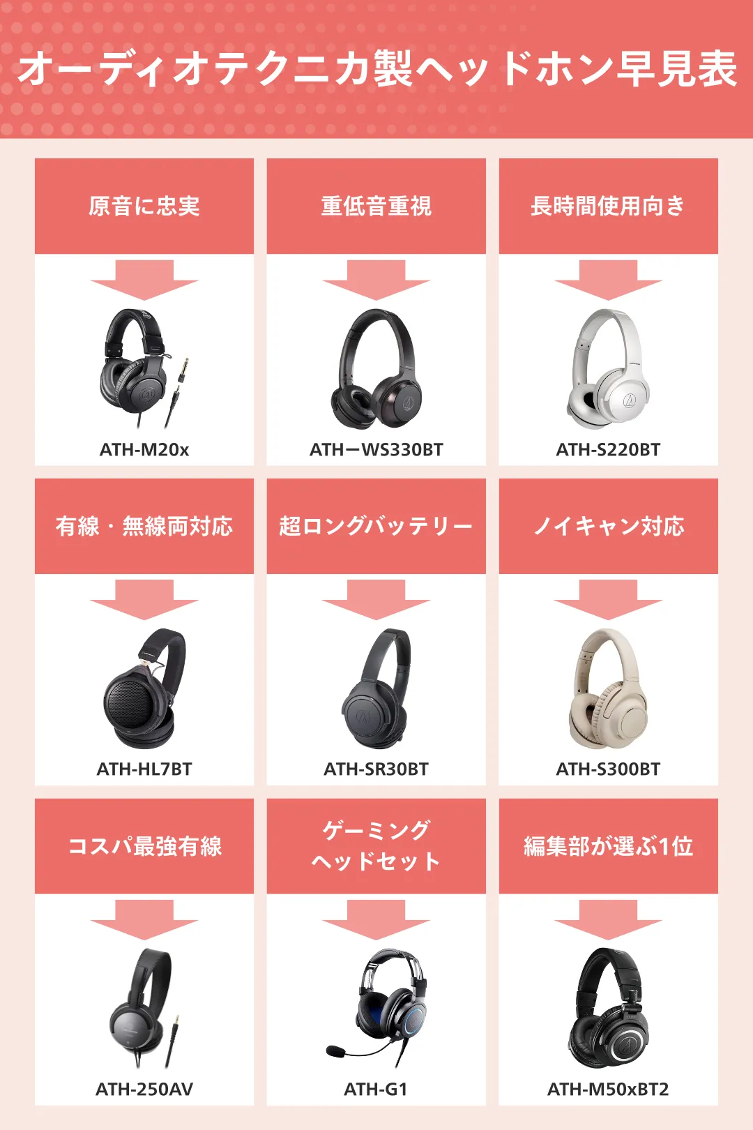 「1」「2」を選んだ方は、最新フラグシップモデル「ATH-M50xBT2」で決まりです。本記事で紹介している他モデルと比較してほぼすべての点で優れており、今、オーディオテクニカのヘッドホンを購入するならば、間違いない選択肢と言えます。