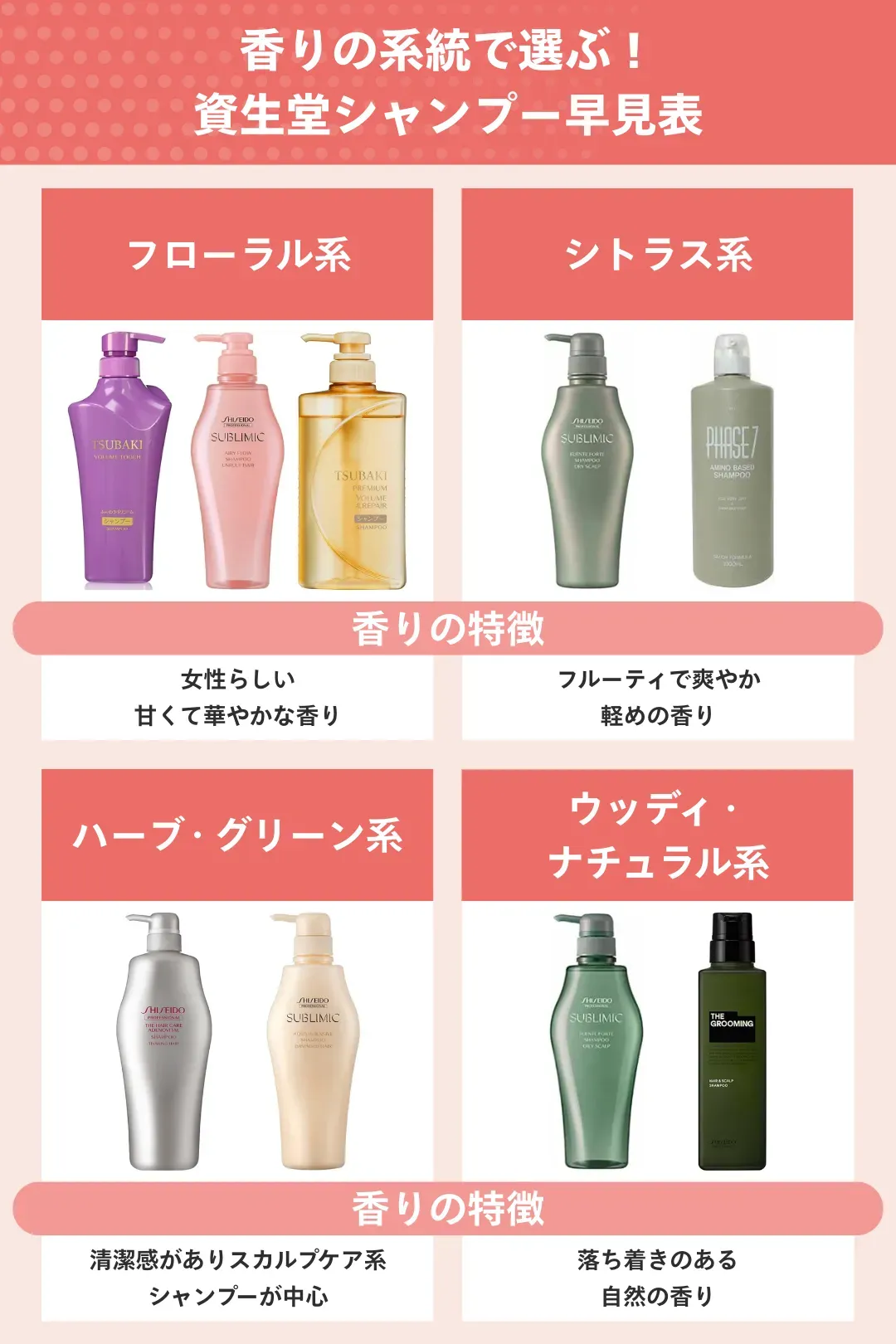 資生堂では、椿やローズなどの花々にフルーツの甘さを加えた、上品で艶っぽい「フルーティフローラル」系の香りを多くラインナップしています。また、森林浴をイメージさせる「ハーバルグリーン」や「ウッディ」系の香りもあり、甘さを抑えた清々しい香りでリラックスしたい方にもおすすめです。