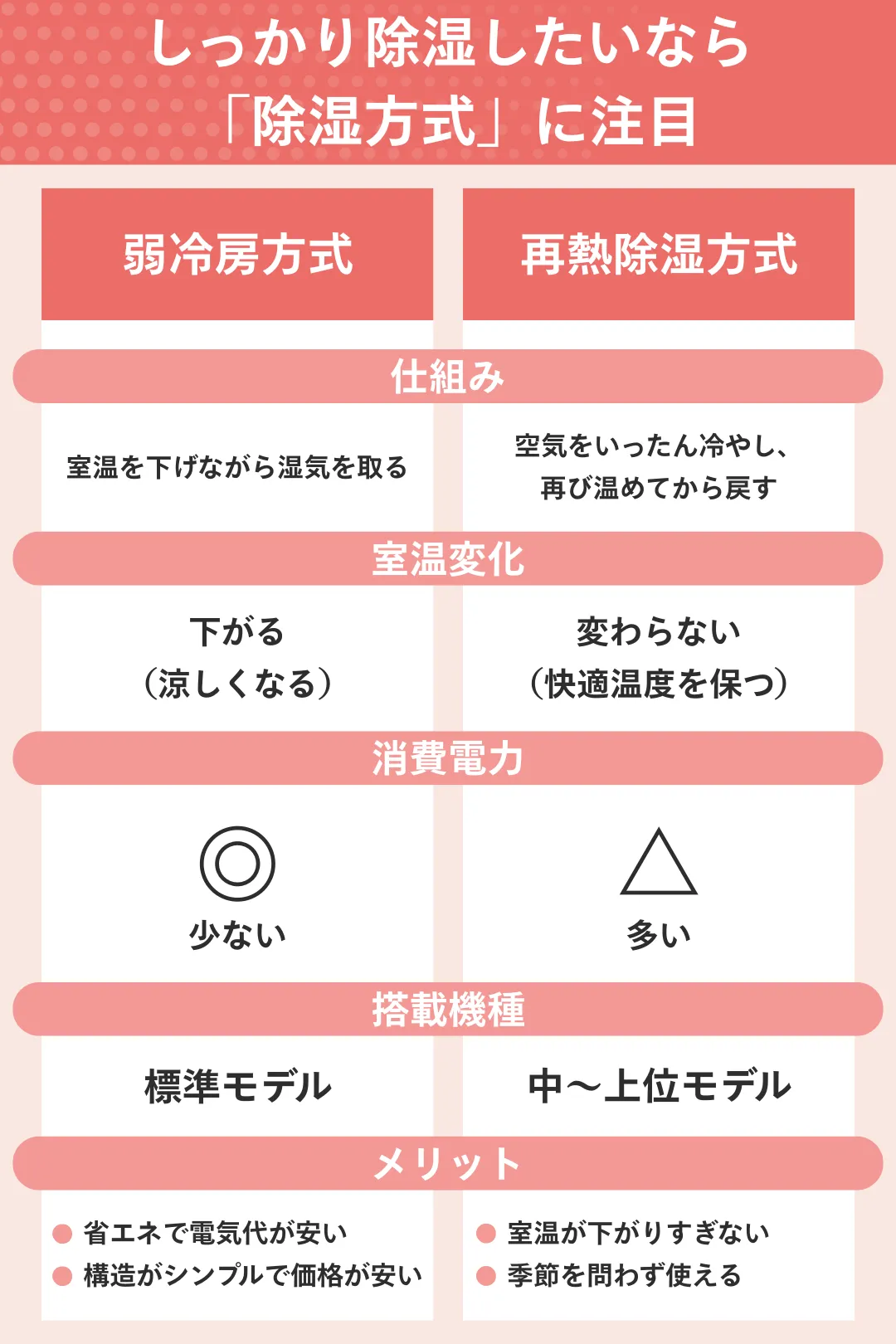 除湿運転には主に「弱冷房方式」と「再熱除湿方式」の2種類があります。弱冷房方式は、冷房と同じ仕組みで空気を冷やして湿気を取り除く方式。消費電力が少なく、安価な機種にも搭載されていますが、室温が下がりすぎやすいのがデメリットです。