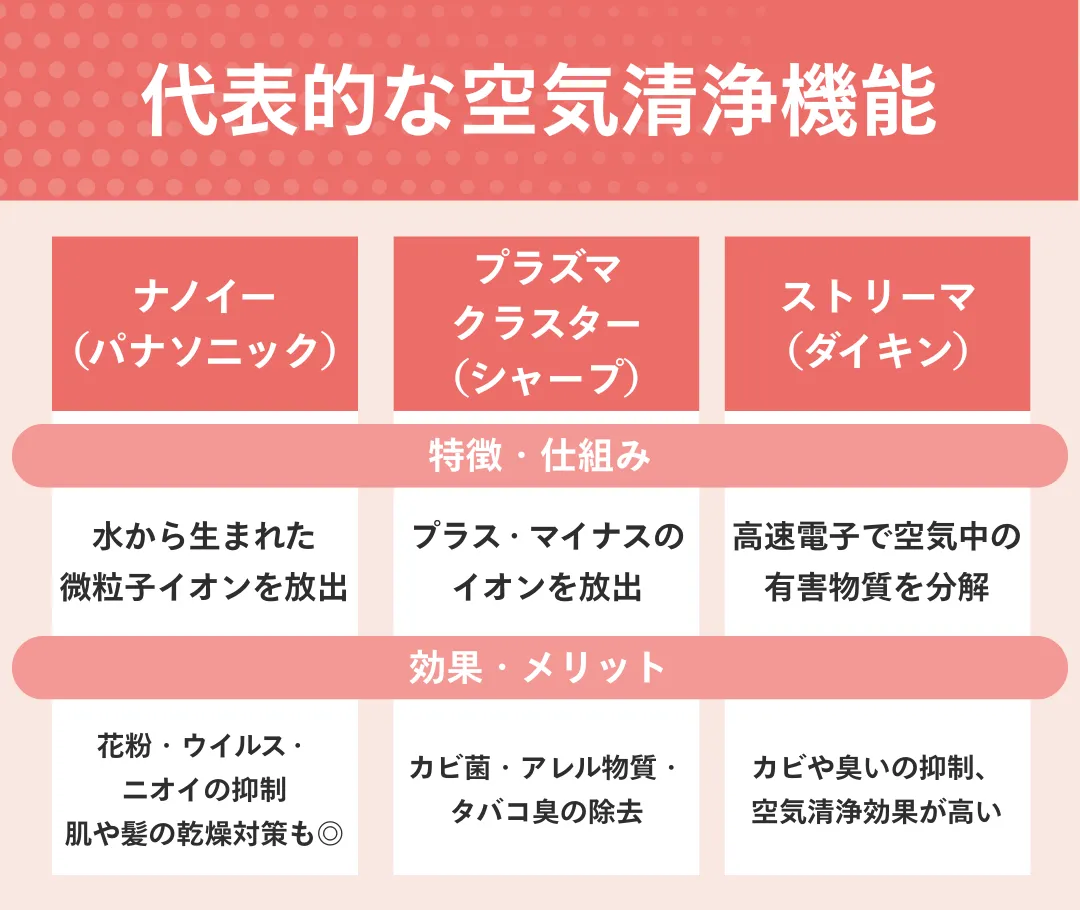 代表的な機能として有名なのはナノイー(パナソニック)、プラズマクラスター(シャープ)、ストリーマ(ダイキン)の3つです。これらの機能を搭載したモデルは、冷暖房をしながら部屋の空気をきれいに保てるため、花粉シーズンや梅雨時期にも役立ちます。とくに小さな子どもやペットのいる家庭、アレルギー体質の人には大きなメリットがあります。
