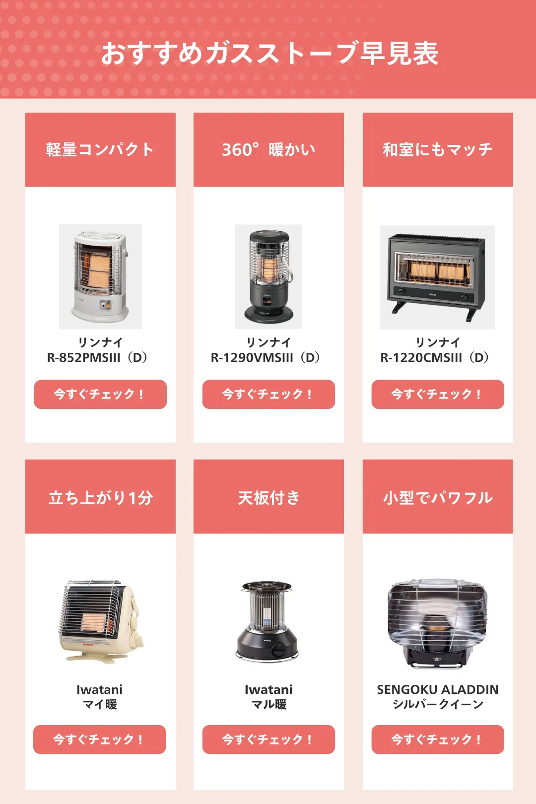 安全機能のほかにも、ガスストーブは機種によってさまざまな機能を備えたモデルがあります。早見表を参考に、ご自身の生活スタイルに合った一台を選んでみてください。