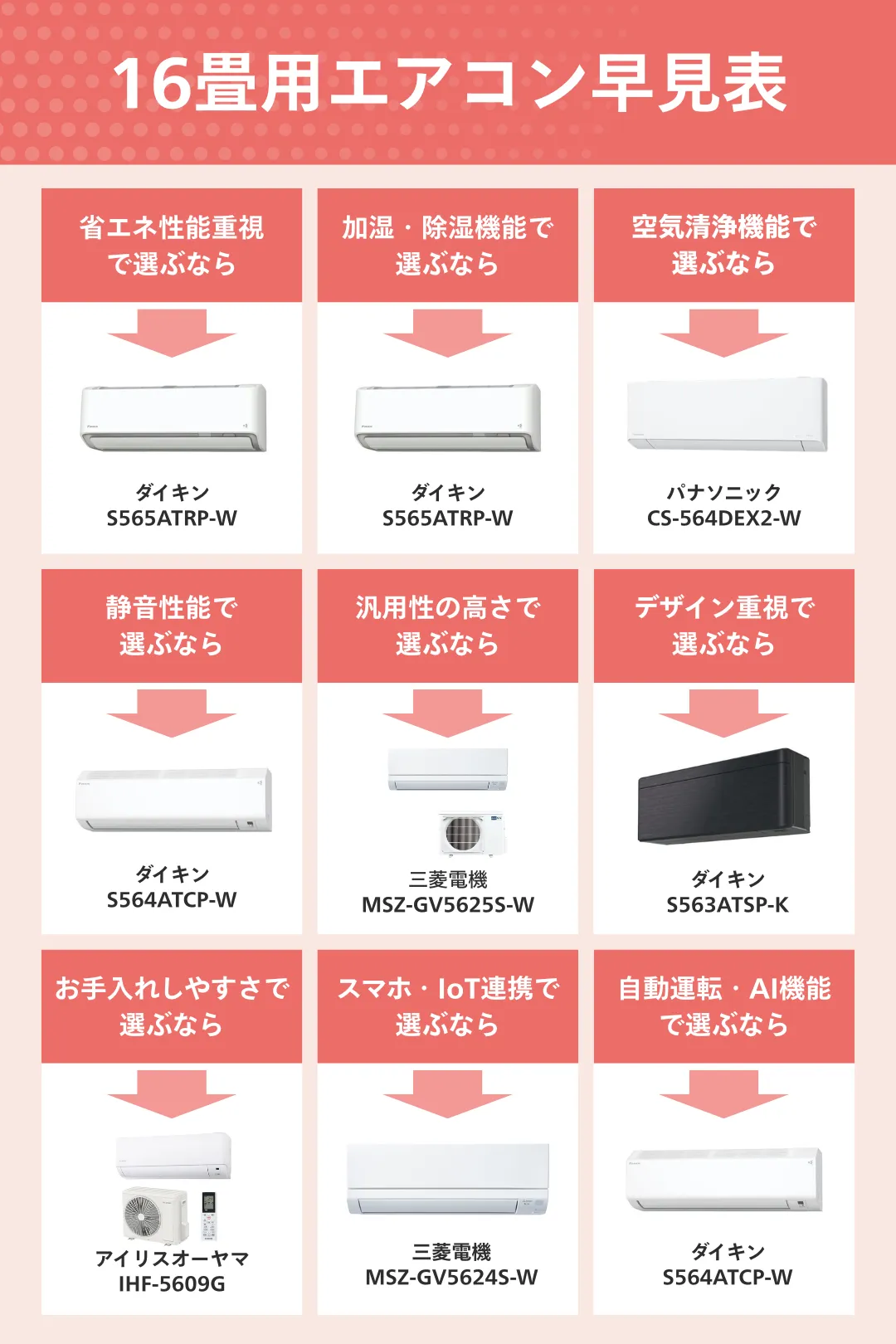 本記事では、どれを選ぶべきか迷っている方に向け、「省エネ」「静音」「お手入れ」といった9つのポイント別に最適な機種をピックアップしました。重視したいポイントを考えながら、10年使える一台を選んでいきましょう。