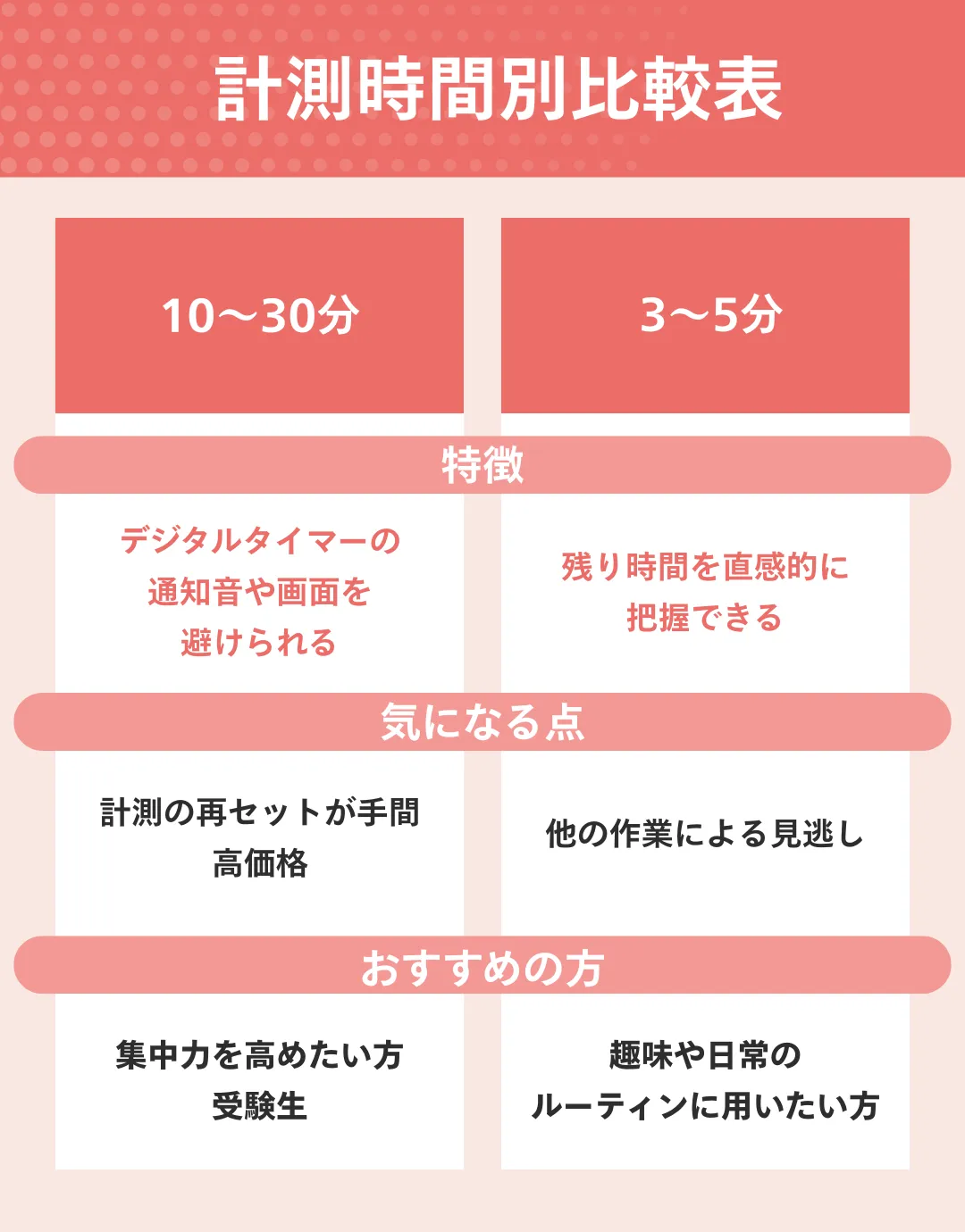 ・料理タイマーや作業の区切りなど、さまざまなシーンで使用できる