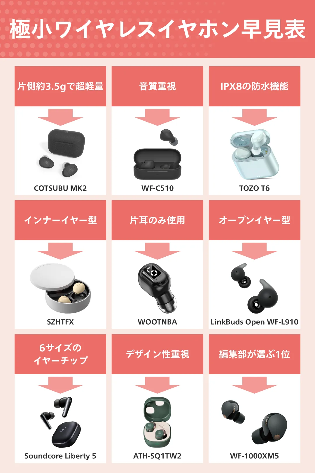 一方、3万円は手が出ない方も「何を重視するか」を明確にすることで、自分に合った一台が選べます。極小ワイヤレスイヤホン選びでチェックすべきポイントは、ズバリ4点です。