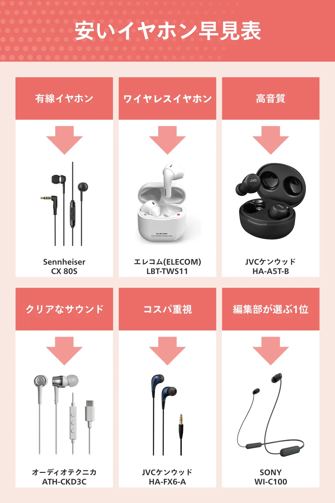 一方、4,000円以上は手が出ない方も「何を重視するか」を明確にすることで、自分に合った一台が選べます。安いイヤホン選びでチェックすべきポイントは、ズバリ5点です。