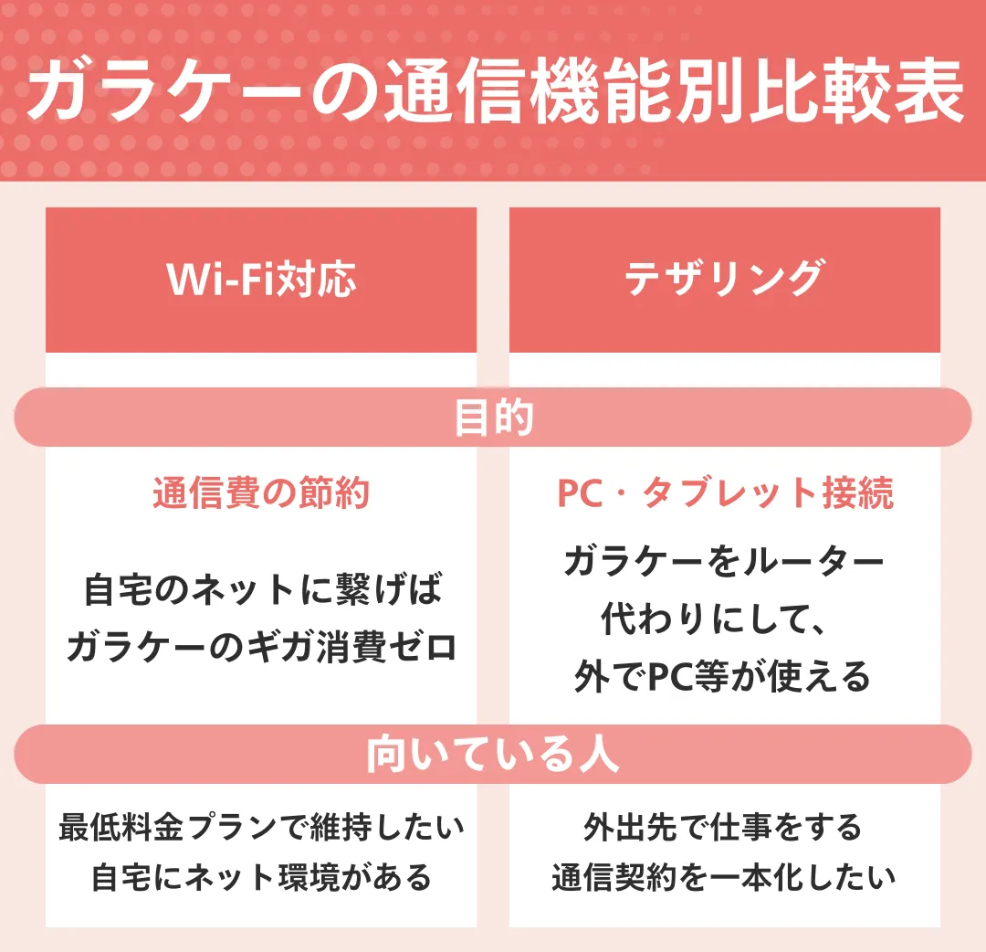 ご自身の用途に「Wi-Fi」や「テザリング」が必要かチェックしましょう。これらは「通信費の節約」や「PC接続」をしたい方向けのプラスアルファの機能ですので、通話とメールがメインの方は、この項目は気にせず飛ばしてOKです。