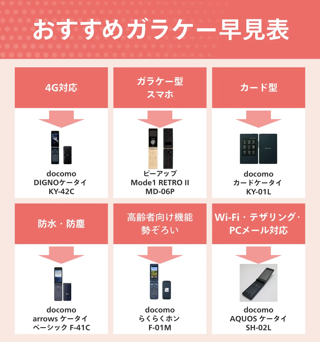 ガラケー(ガラホ)は「何を重視するか」を明確にすることで、自分に合った一台が選べます。ガラケー選びでチェックすべきポイントは、ズバリ4点です。