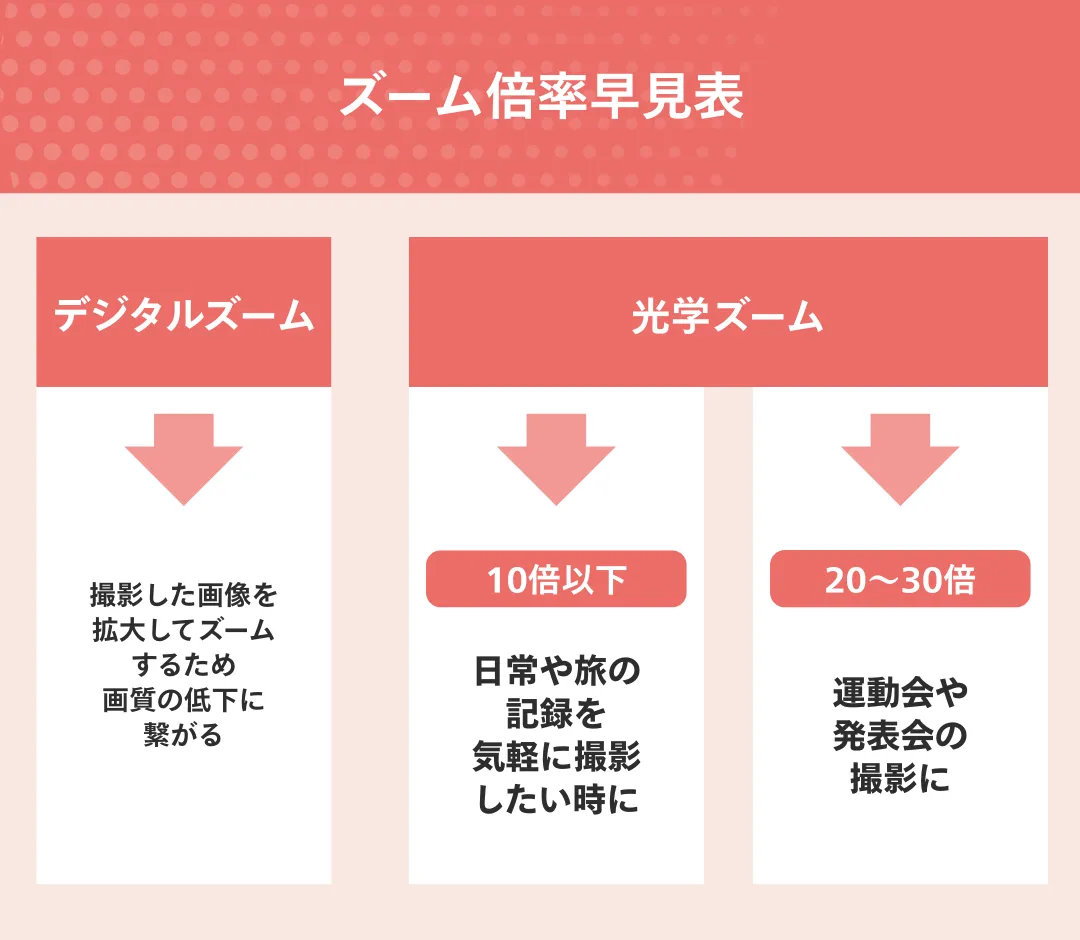 機種ごとにズーム倍率を比較する場合は、画質が劣化しにくい光学ズームを基準にしましょう。以下の解説においても、光学ズームの場合の倍率について取り上げています。