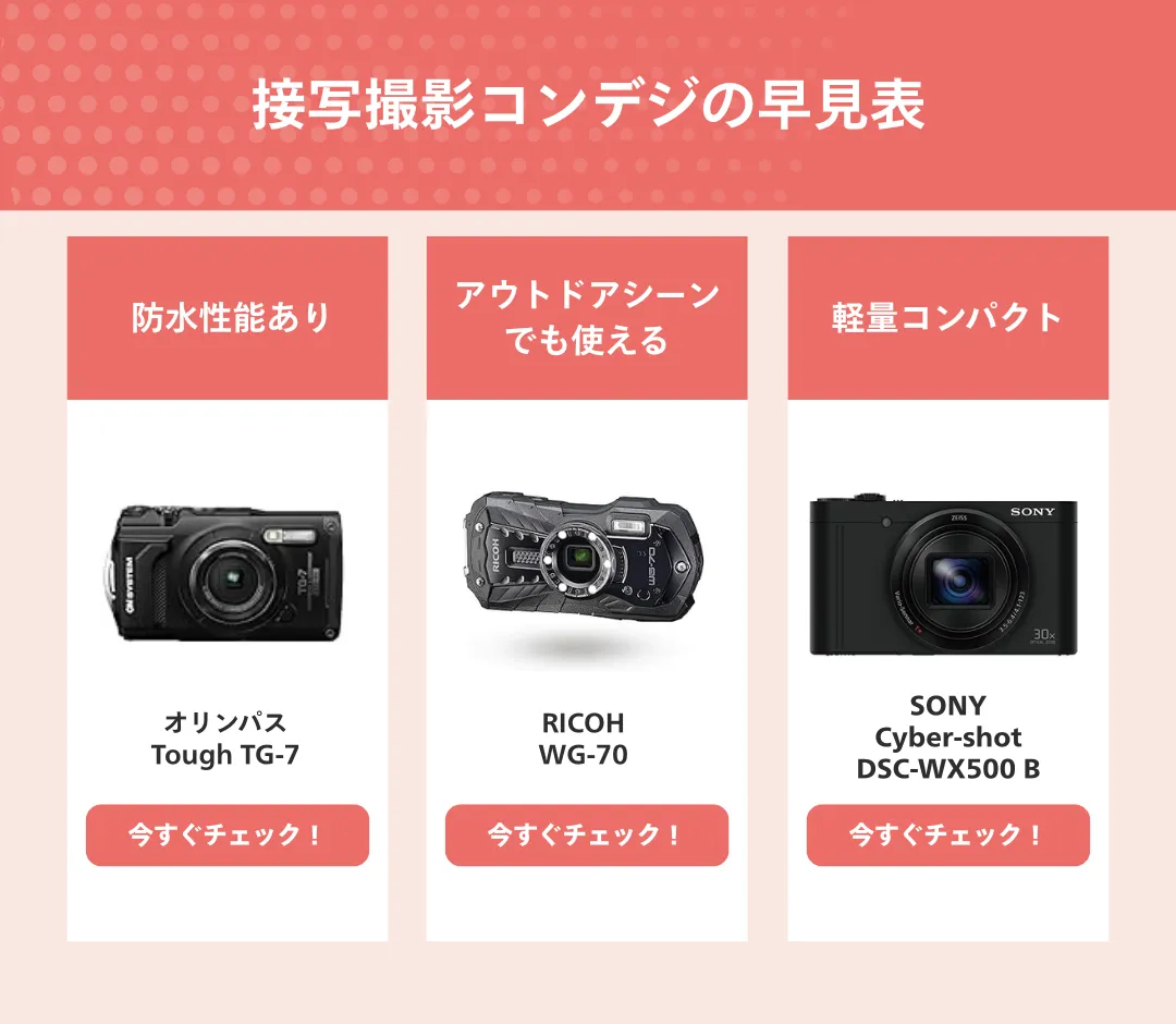 - 1~3万円:一部のモデルではズーム機能搭載。アウトドアで使える防水防塵カメラもあり。