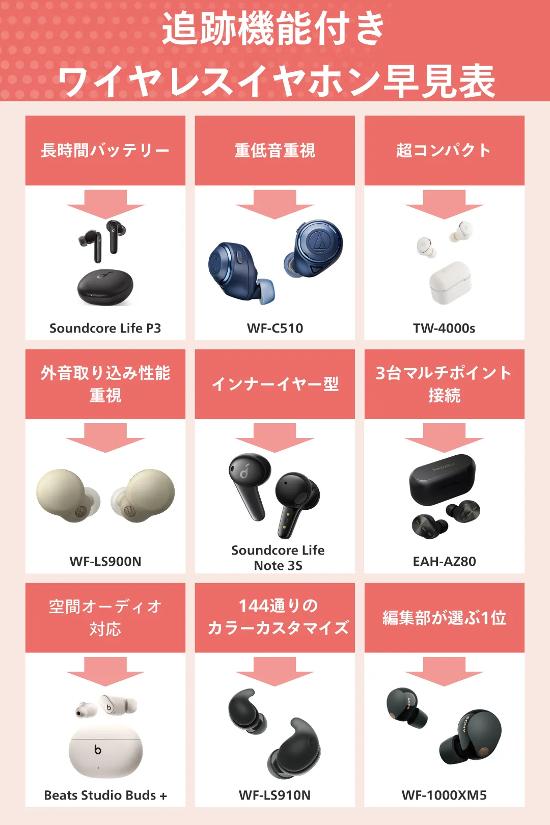 「1」「2」を選んだ方は、ソニーの最新フラグシップモデル「WF-1000XM5」で決まりです。本記事で紹介している他モデルと比較してほぼすべての点で優れており、今、追跡機能付きワイヤレスイヤホンを購入するならば、間違いない選択肢と言えます。