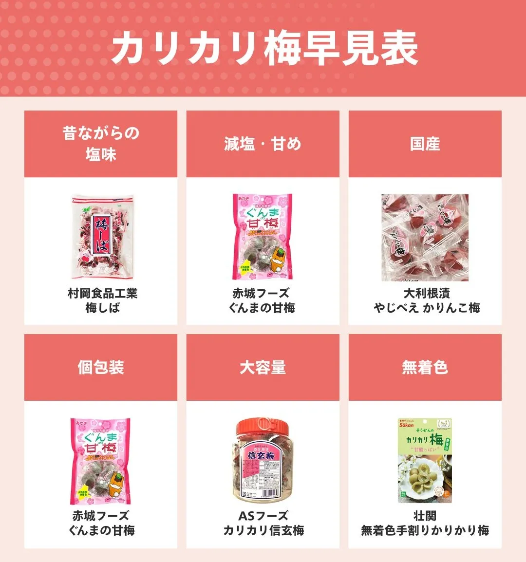 国内産に比べて価格が安価になる傾向があるため、コストパフォーマンスを最優先したい場合におすすめです。基本的なカリカリとした食感や、酸味・塩分の機能は維持されているため、業務用利用や、日常的に手軽な塩分補給として大量消費したい場合に選択肢に入ります。