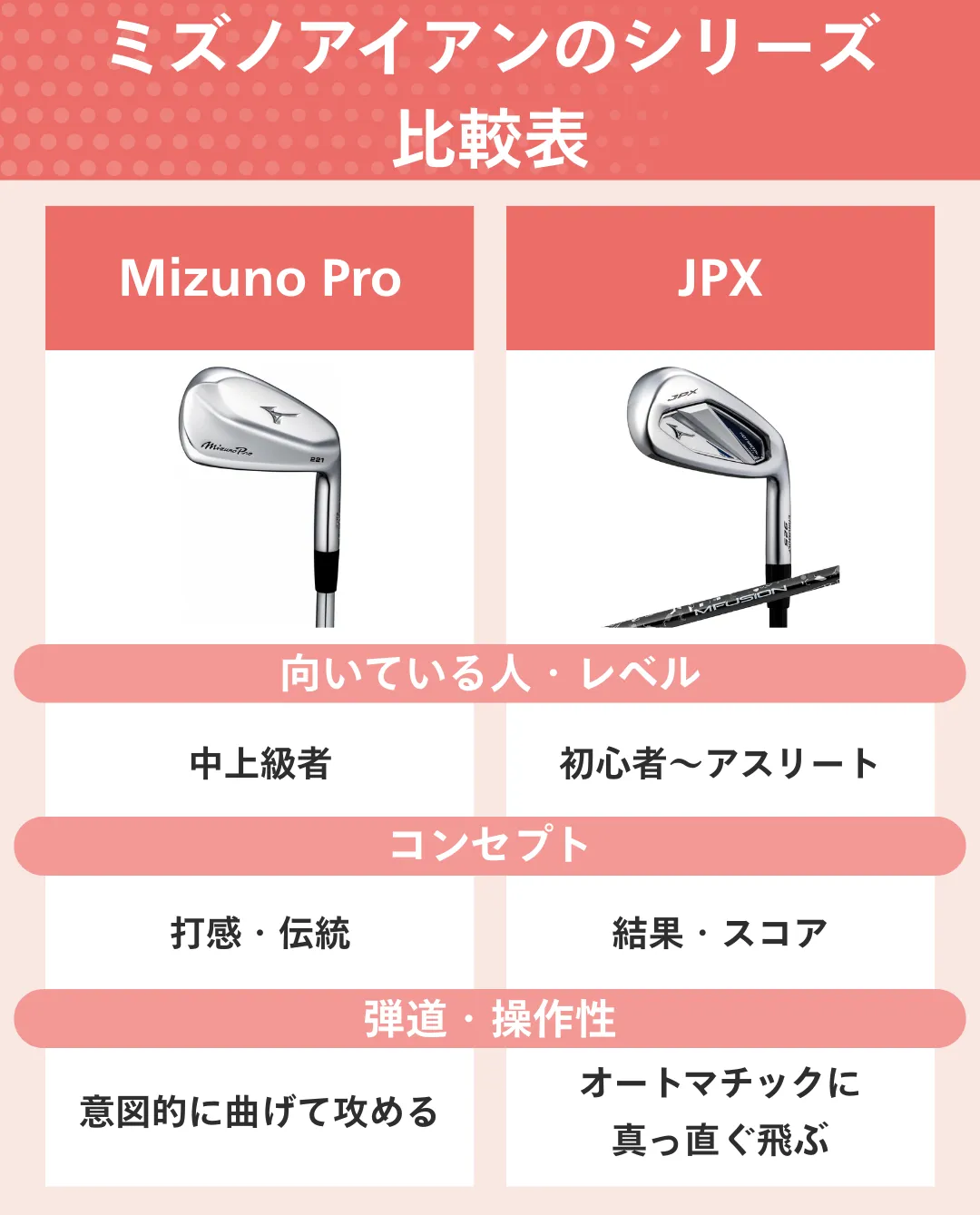 ミズノのアイアン選びは、まず「2つのブランド」のどちらに進むかを決めることから始まります。 伝統と打感を極めた「Mizuno Pro」か、やさしさと飛距離の「JPX」かで選びます。