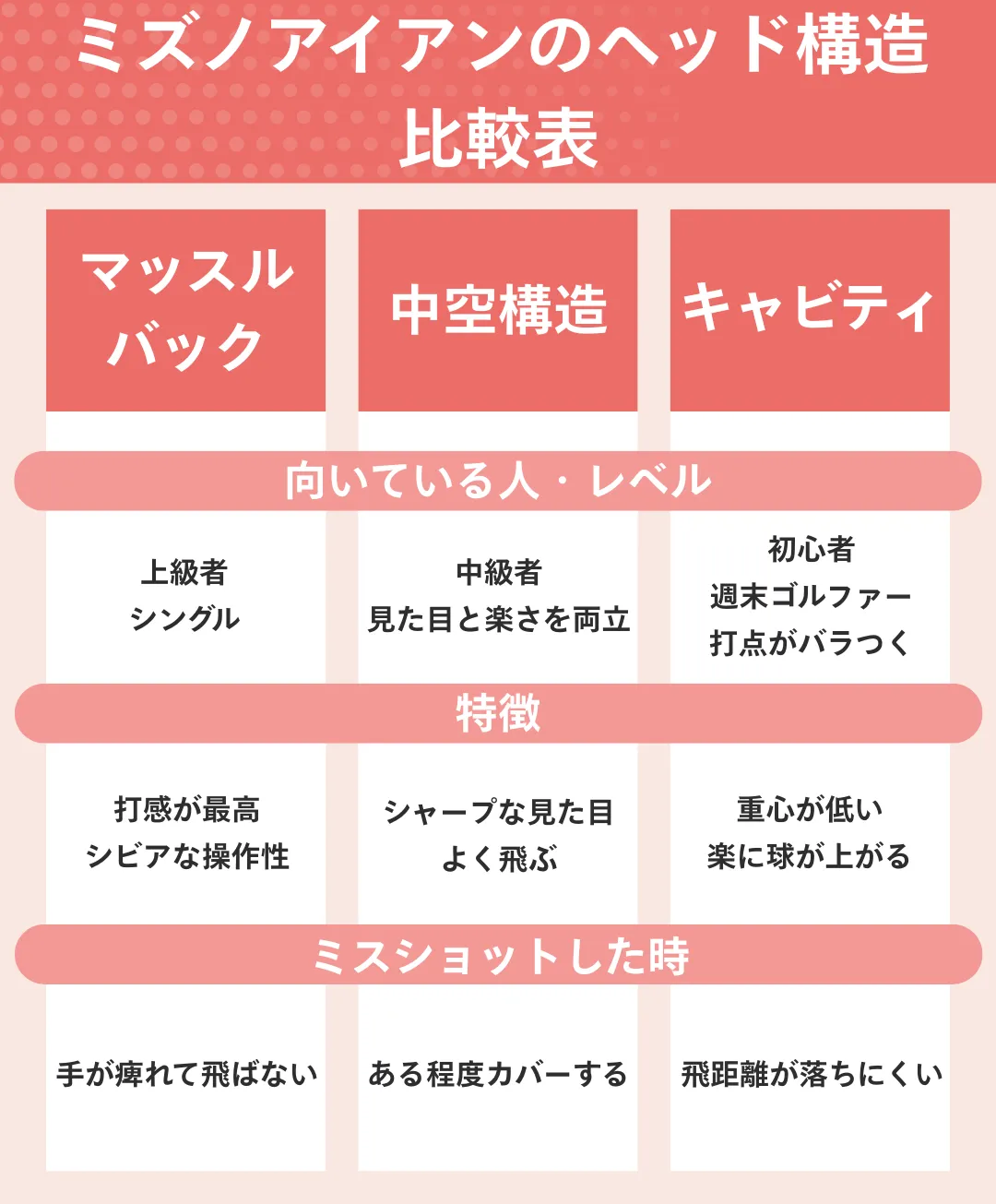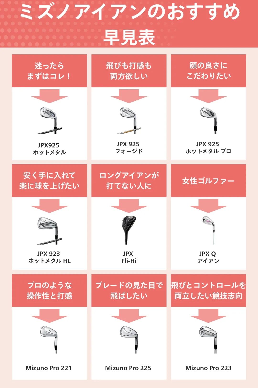 ミズノのアイアンは「何を重視するか」を明確にすることで、自分に合った一本が選べます。ミズノのアイアン選びでチェックすべきポイントは、ズバリ以下です。