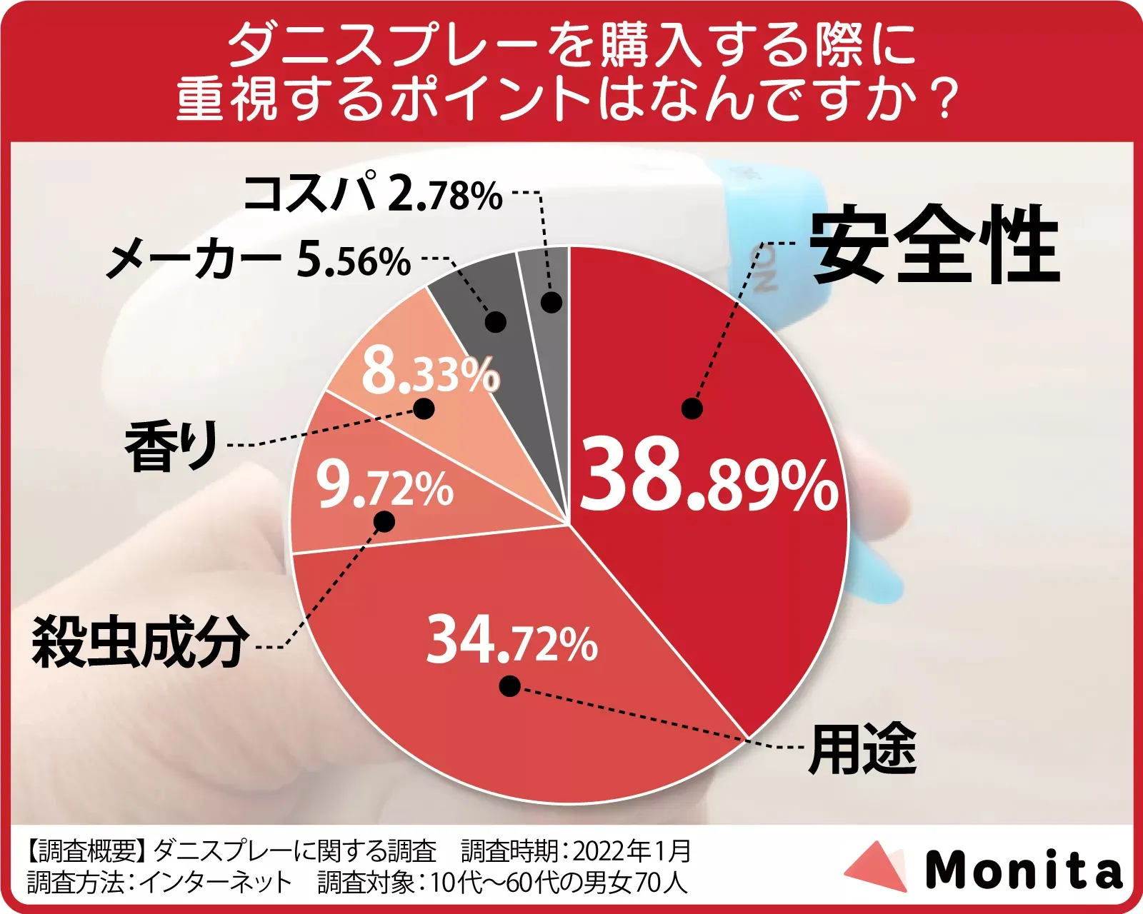 まずはダニ対策をしている70人にダニスプレーを選ぶポイントについてお伺いしたところ、結果は天然成分やアレルギーテスト済み*などの「安全性」が40%近い票を得て1位となりました。次いで2位は駆除・予防などの「用途」で約35%、3位は「殺虫成分」で約10%です。