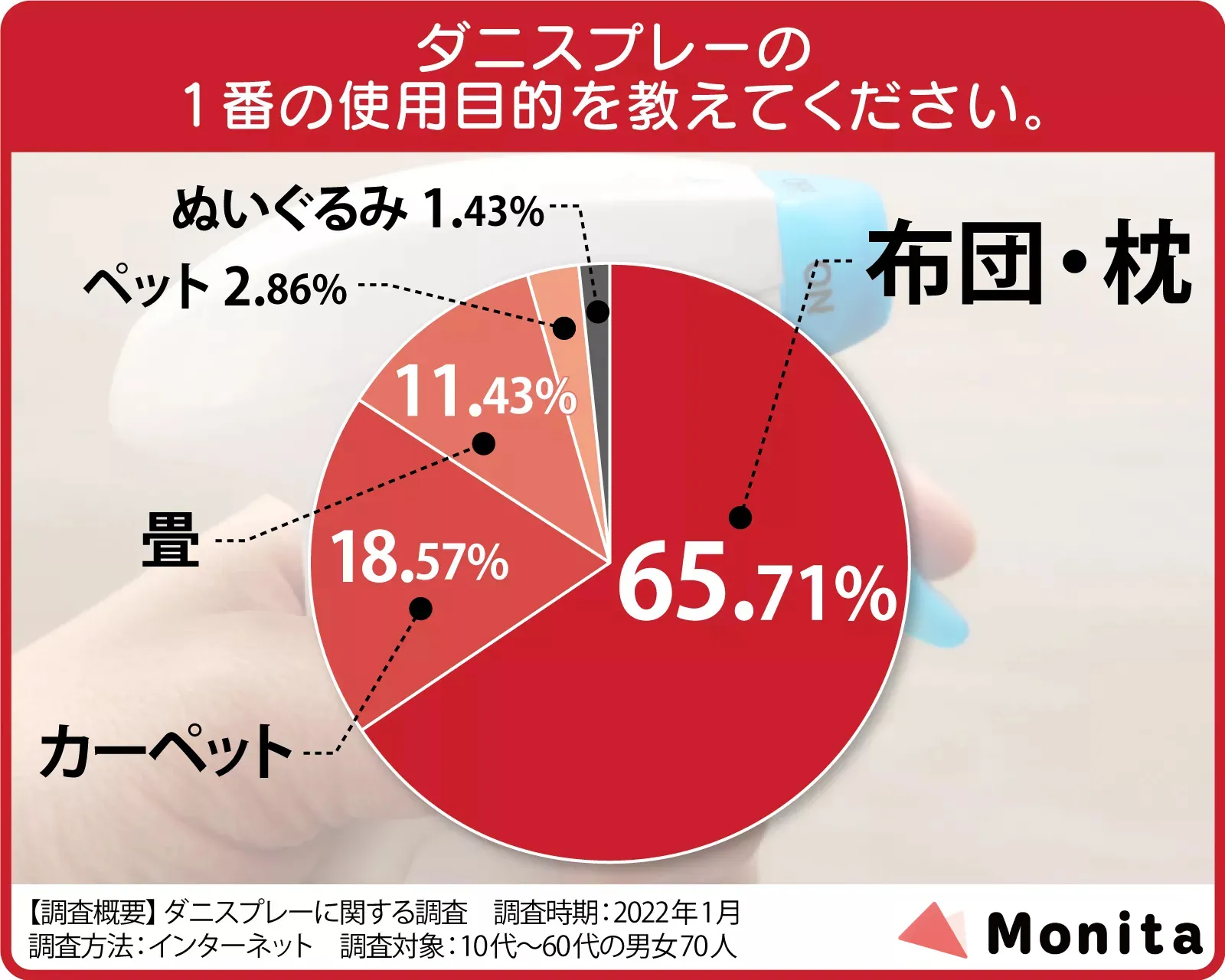 全体の2/3近くの方が寝具のダニ対策としてスプレーを購入しています。寝具は体温と寝汗により高温多湿になりやすく、ダニの餌となる皮脂や垢もあるためダニにとっては最適な環境です。