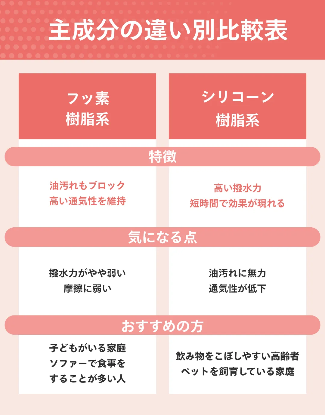 「リビングでの飲食によるシミを徹底的に防ぎたい」「小さな子供やペットがいるので、ニオイが残らない安全なものを使いたい」などの使用シーンを明確にすると、選ぶべき商品は自然と絞られてきます。