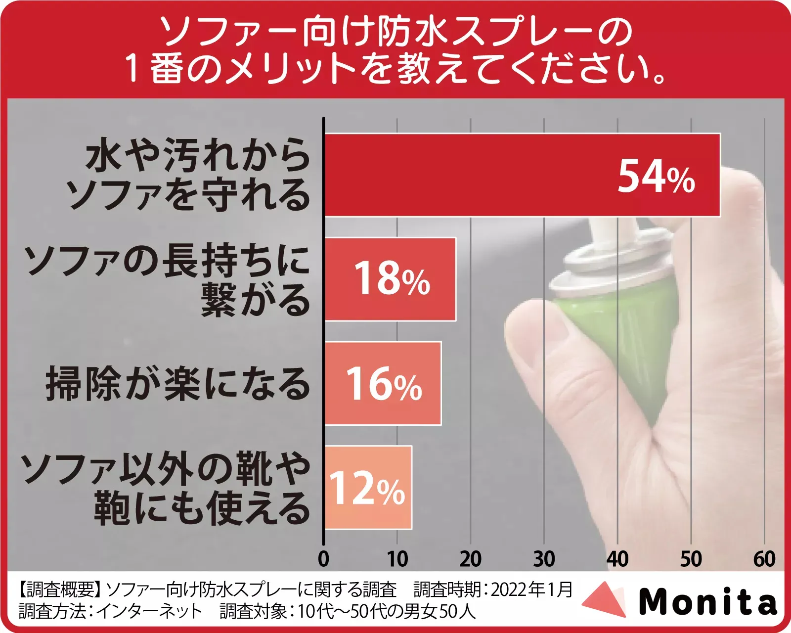 ソファ向け防水スプレーを使用した1番のメリットについてアンケート調査したところ、水や汚れからソファーを守る点をメリットと回答した方が54%で、ダントツの1位でした。ソファーで飲食をしても汚れにくい・綺麗な状態をキープできるといった声が多数あります。