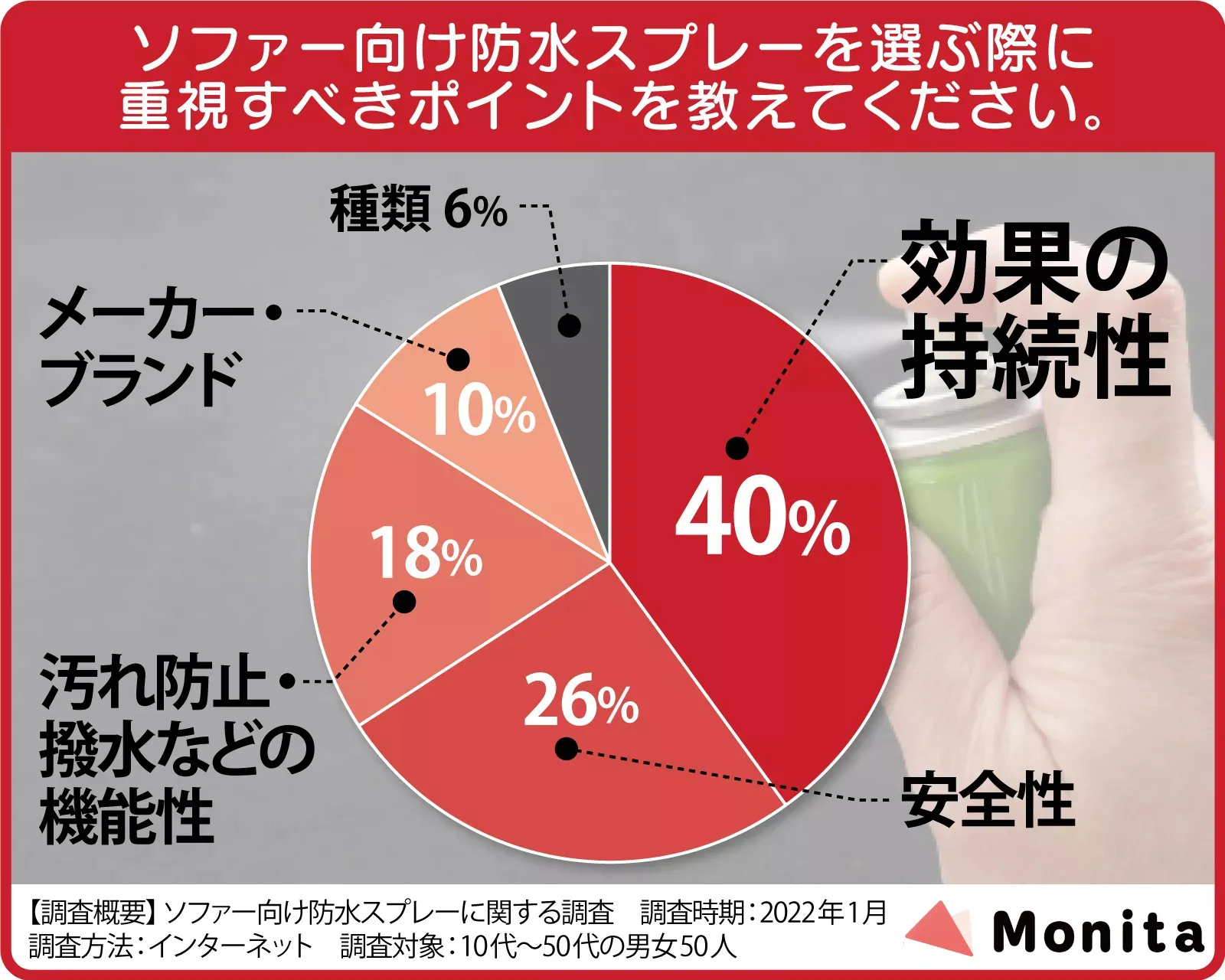 ソファー向け防水スプレーを選ぶ際に最も重視しているポイントを調査した結果、効果がどれくらい持つか・安全性・防水以外の機能性を重視している方が多く、特に効果の長さで選ぶといった回答が40%と、ダントツの1位でした。