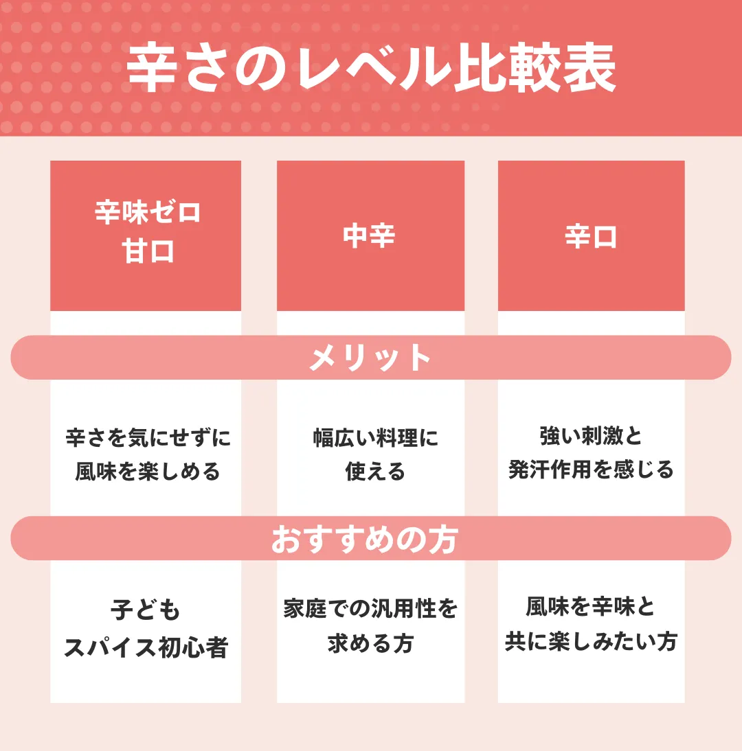 辛味成分の量により、辛味ゼロのマイルドから、強い刺激を持つ辛口までレベルが分かれます。ベースの辛さを決めておくと、家族全員が楽しめるカレー作りが簡単になります。