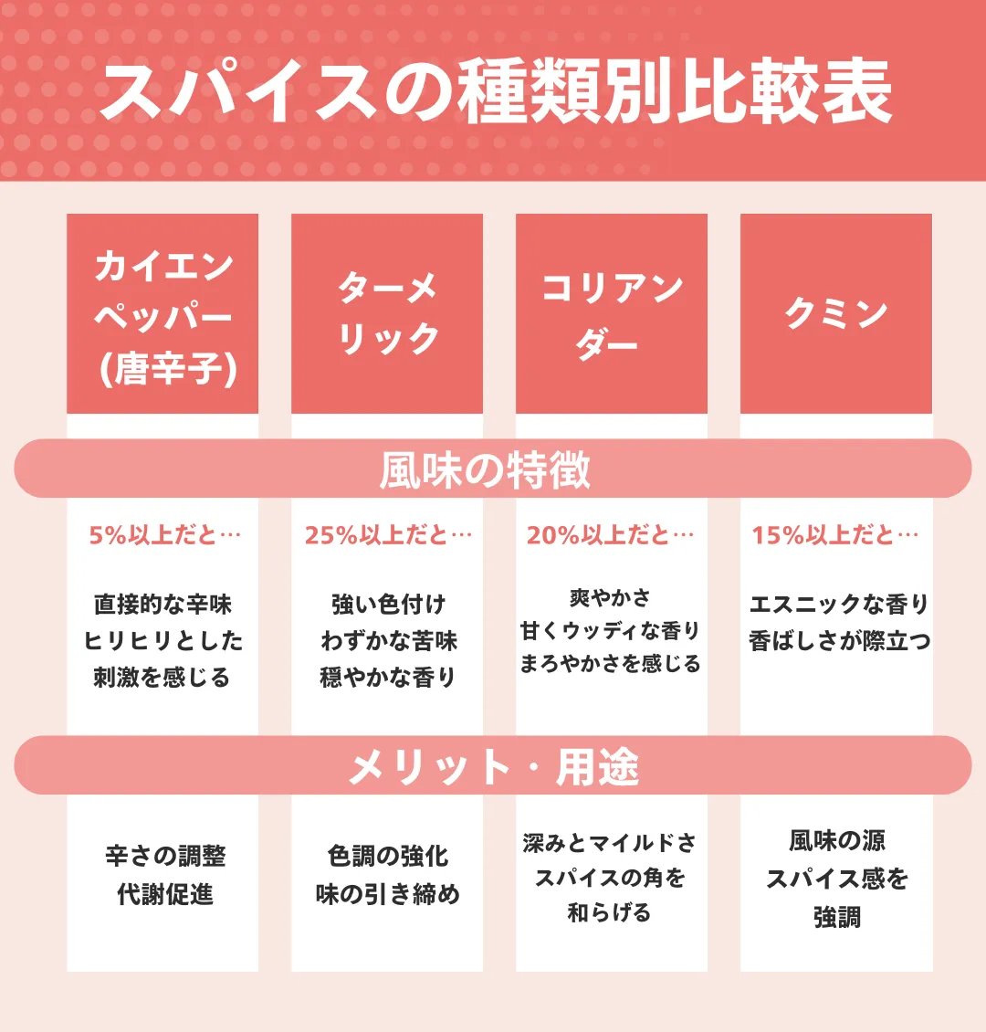 カイエンペッパーが5%以上を占めると、カレー粉の辛さが顕著に高まり、食べた際に口の中に直接的な刺激とヒリヒリ感をもたらします。この比率が高い製品は、辛いもの好きや、料理に強いアクセントとパンチを求める方におすすめです。