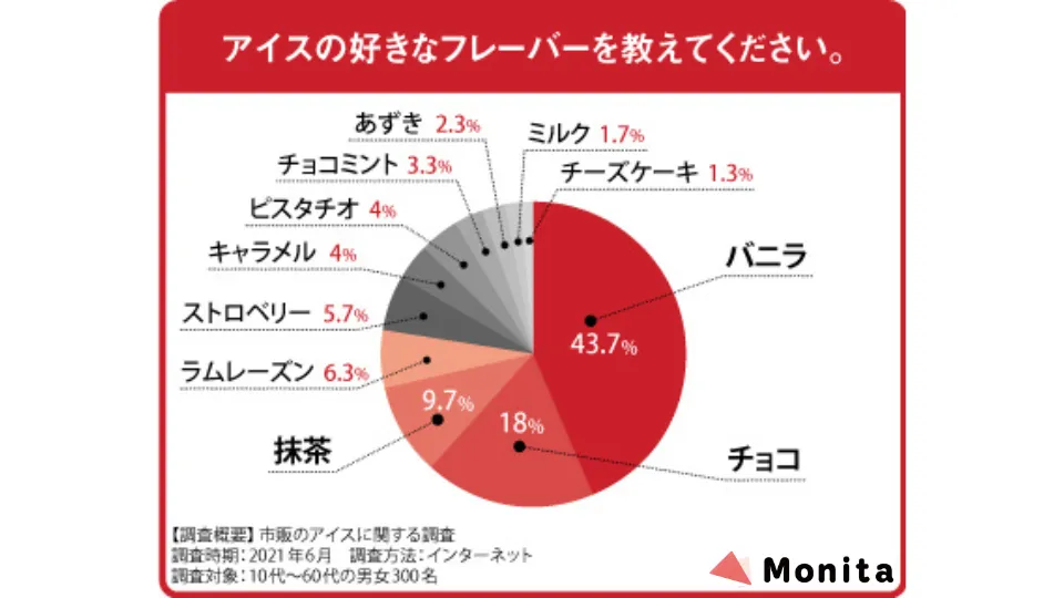 アンケートでは「バニラ」が4割以上と圧倒的に人気のフレーバーでした。ほどよい甘みが魅力のバニラアイスは老若男女問わず人気です。記事の後半ではバニラアイスのアレンジレシピを紹介しているので、ぜひチェックしてください。