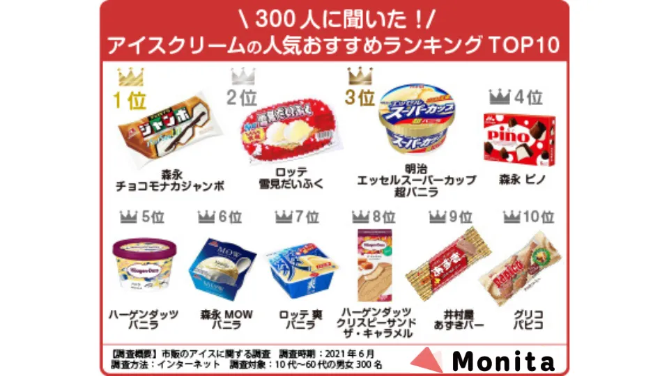 ロングセラー商品でもあり、上位常駐でもあるチョコモナカジャンボはその美味しさがたまらない。パリパリの最中、適度な甘さでパキっと食感も楽しいチョコレート、優しい甘さのバニラで何度も食べたくなってしまいます。私の定番おやつです。