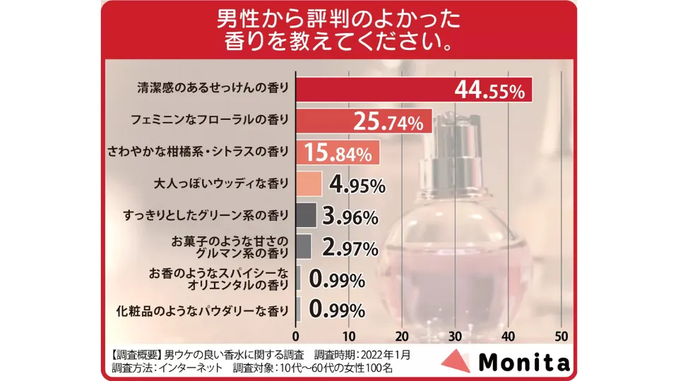 アンケート調査では女性100人を対象におすすめ香水の香りについて質問しました。その結果1位に上がったのが石鹸の香りです。半数近くの方がおすすめする石鹸の香りは清潔感を演出でき、どなたにも好まれます。