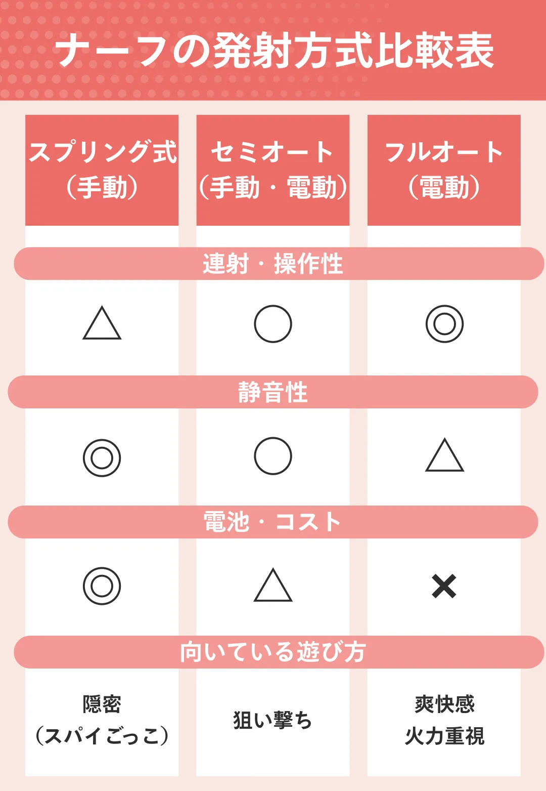 「庭で弾幕を張って走り回りたい」「部屋で静かにスナイパーごっこをしたい」などの使用シーンを明確にすると、選ぶべきモデルは自然と絞られてきます。