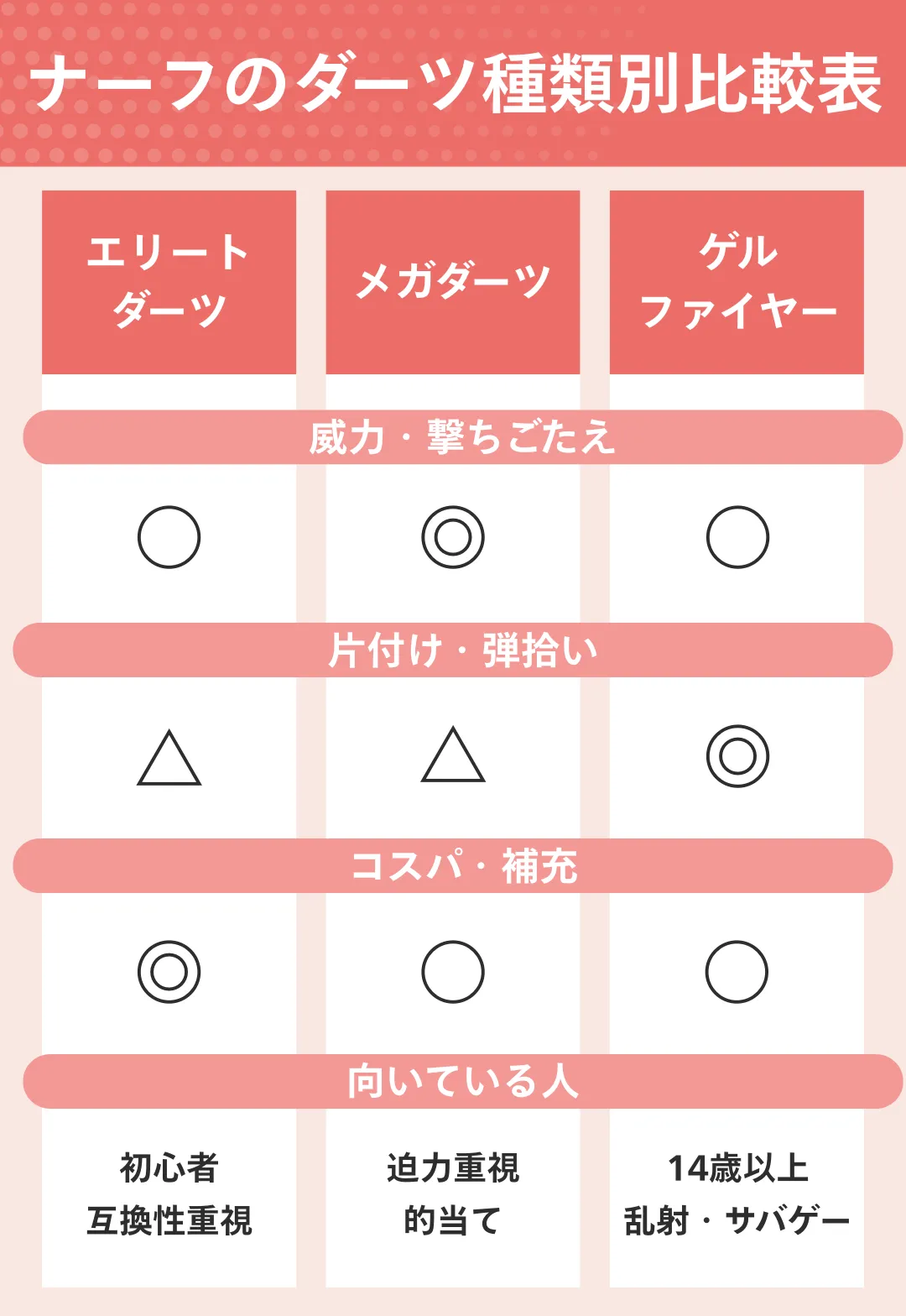 ナーフは「遊び方のスタイル」を明確にすることで、迷わずに最高の一丁を選べます。ナーフ選びでチェックすべきポイントは、大きく分けて4点です。