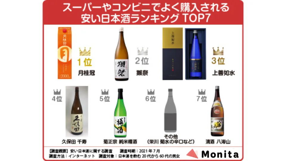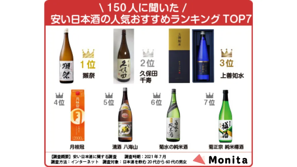 スーパーやコンビニで購入する安くて美味しい日本酒を150人にアンケートした結果、「月桂冠」「獺祭」「上善如水」が票を集めました。ご自宅近くのコンビニやスーパーに、ランクインしている商品があるかチェックしてみてください。