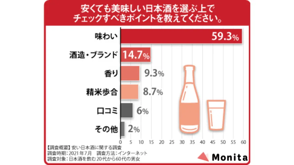 安くても美味しい日本酒を選ぶ上でチェックすべきポイントを150人にアンケートした結果、「味わい」が最も多く票を集めました。ほかにも、酒造・ブランド・香りを重視するとの声もありました。選ぶ際の参考にしてください。