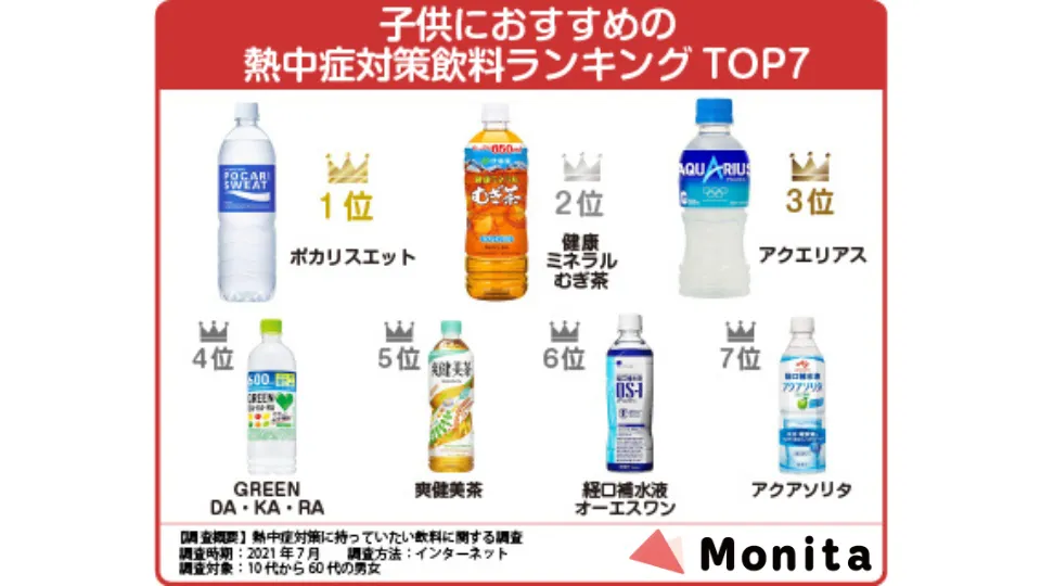 子供におすすめの熱中症対策飲料を300人にアンケートした結果、「ポカリスエット」「健康ミネラルむぎ茶」「アクエリアス」が票を集めました。お子さんに持たせる熱中症対策飲料にお悩みの方は、この3商品から選んでみてください。
