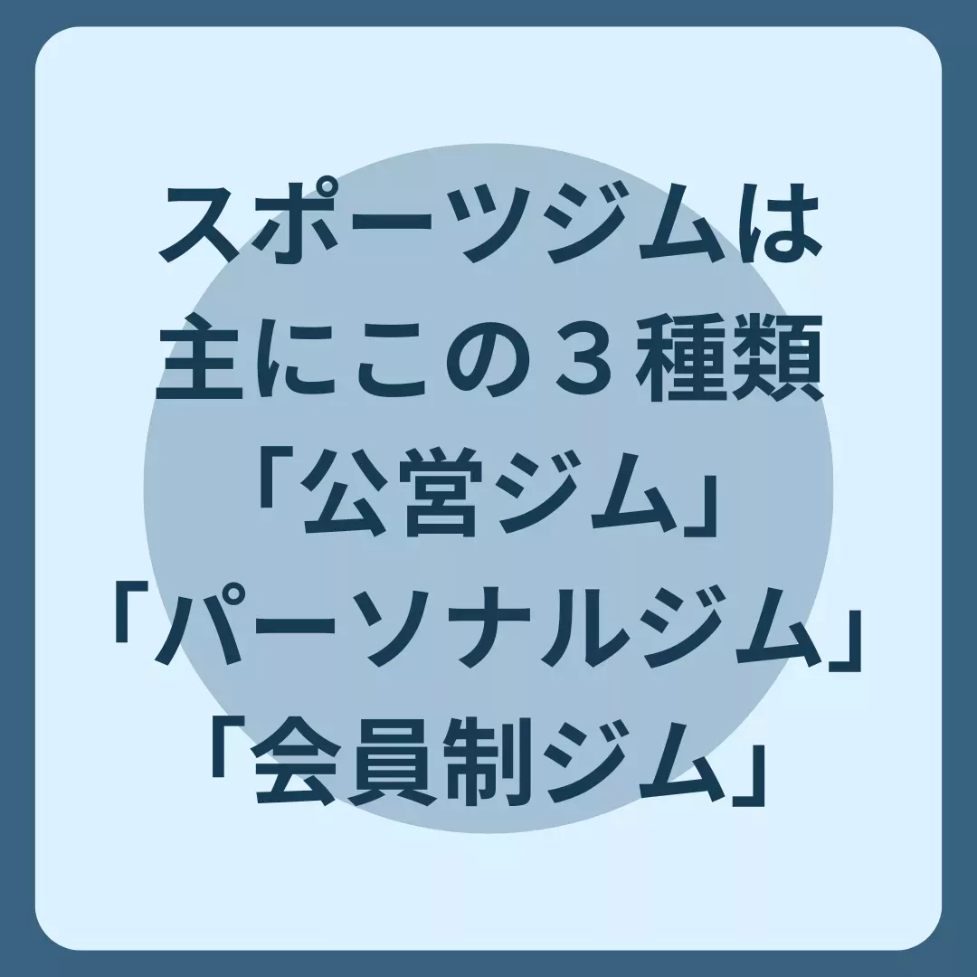 スポーツジムには「公営ジム」「パーソナルトレーニングジム」「会員制スポーツジム」の3種類があります。
