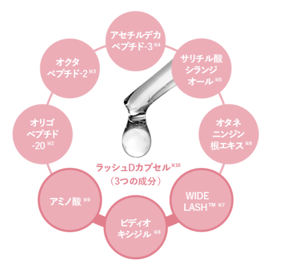 ※1 保湿・ハリコシ成分:ラッシュDカプセル(白金 、ビオチノイルトリペプチド-1、パンテノール、グリセリン、ピロリジニルジアミノピリミジンオキシド 、シスチン、グルタミン酸 )