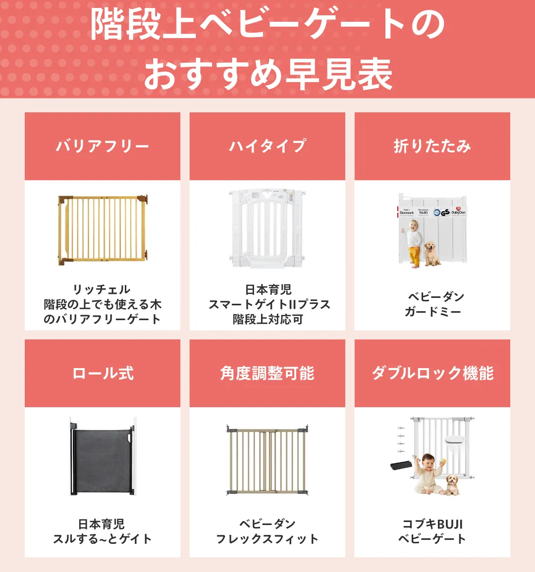 「子供を抱っこして昇り降りする」「廊下が狭くて扉が開けない」などの使用シーンを明確にすると、選ぶべき商品は自然と絞られてきます。