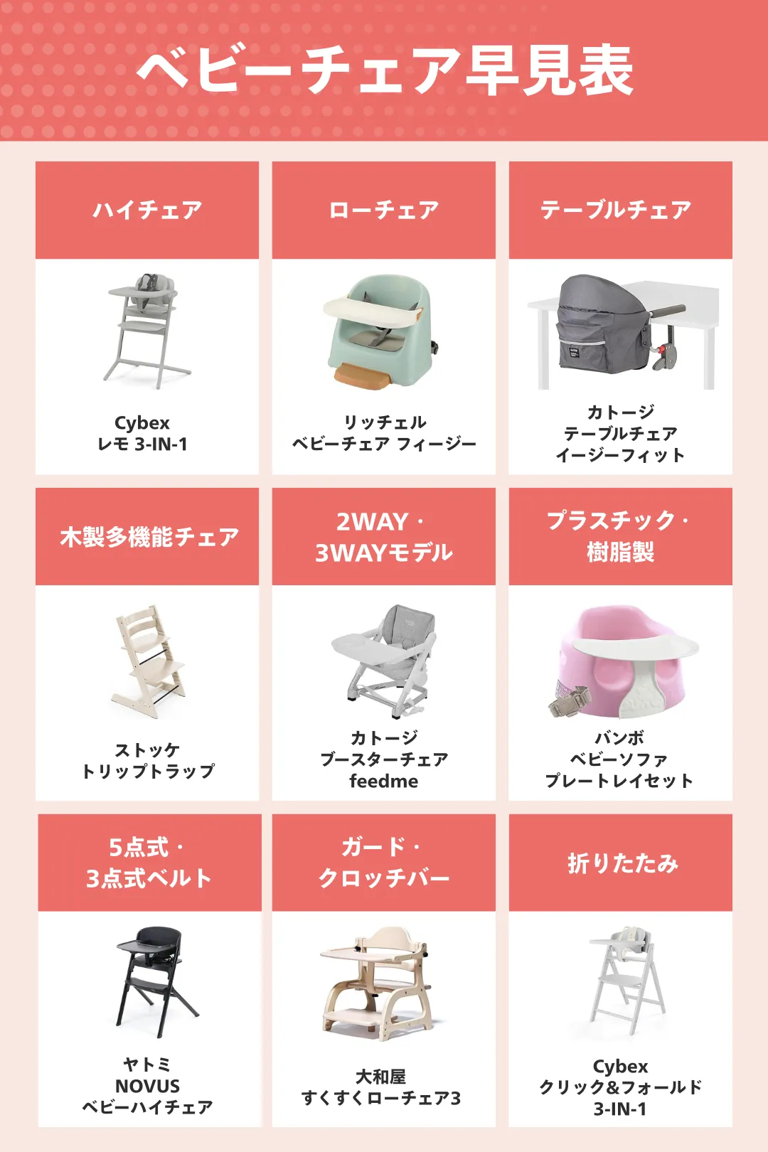 ベビーチェアは「何を重視するか」を明確にすることで、自分に合った一台が選べます。ベビーチェア選びでチェックすべきポイントは、ズバリ以下です。