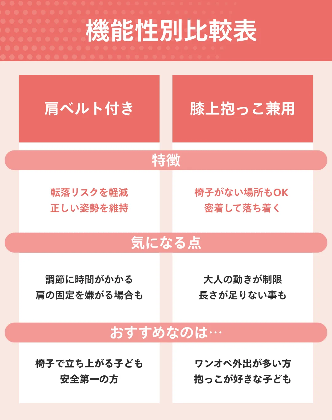 安全性を何よりも重視し、食事中に席を立つ習慣をつけたくない家庭において、肩ベルトの存在は大きな安心材料となります。3点固定式では不安を感じる活発な性格のお子様を持つユーザーにとって、最優先すべき切り口です。