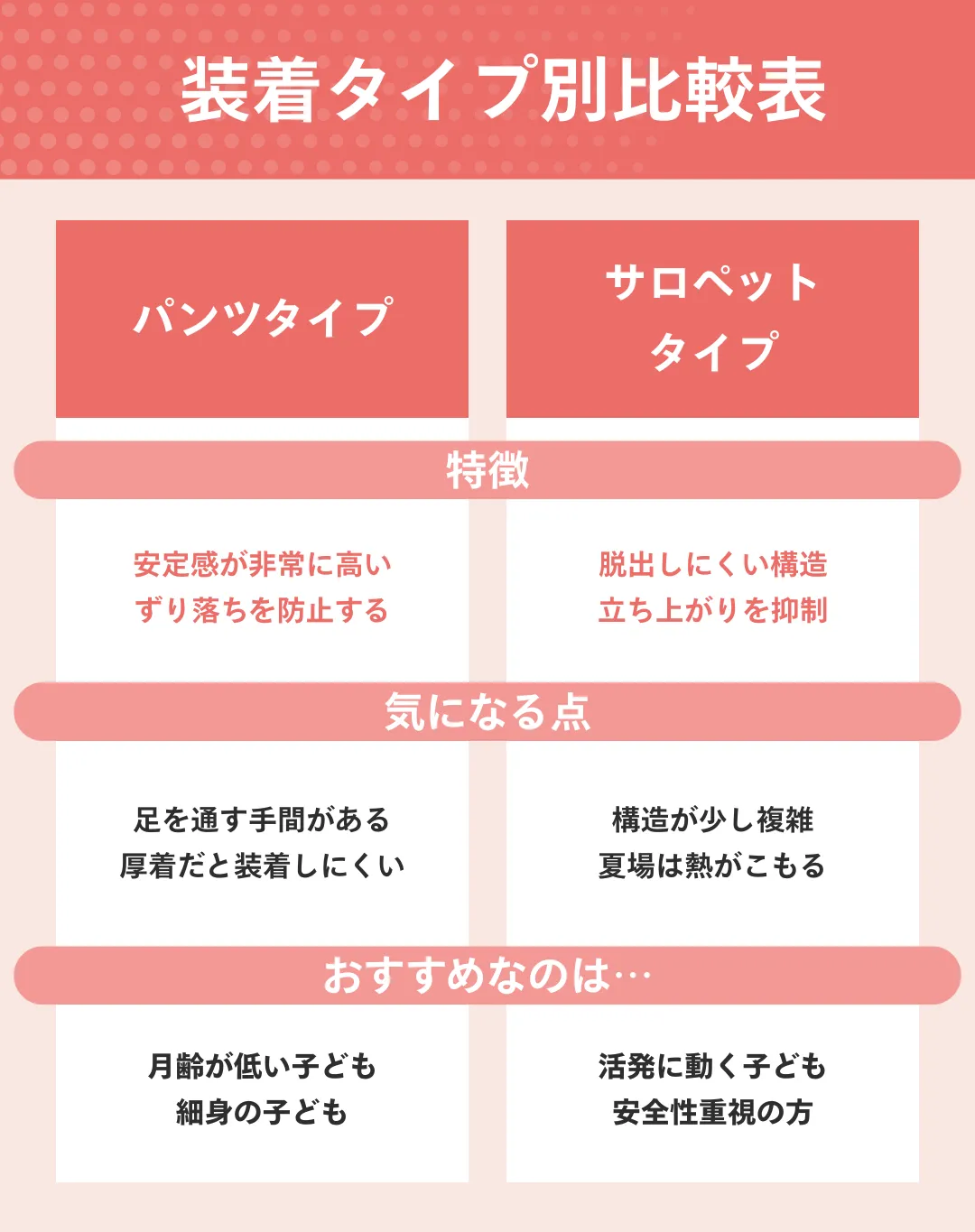 椅子の上で立ち上がろうとしたり、激しく動いたりするお子様には、肩ベルトとパンツ型が一体となったサロペット型の製品が推奨されます。サロペット型は、お子様の肩から股下までをしっかりとホールドするため、上半身の抜け出しを物理的に防ぐ力が非常に強いのが特徴です。服を着せるような感覚で装着できるため、一度固定してしまえばお子様が自力で脱出することは難しく、食事に集中しやすい環境を整えられます。
