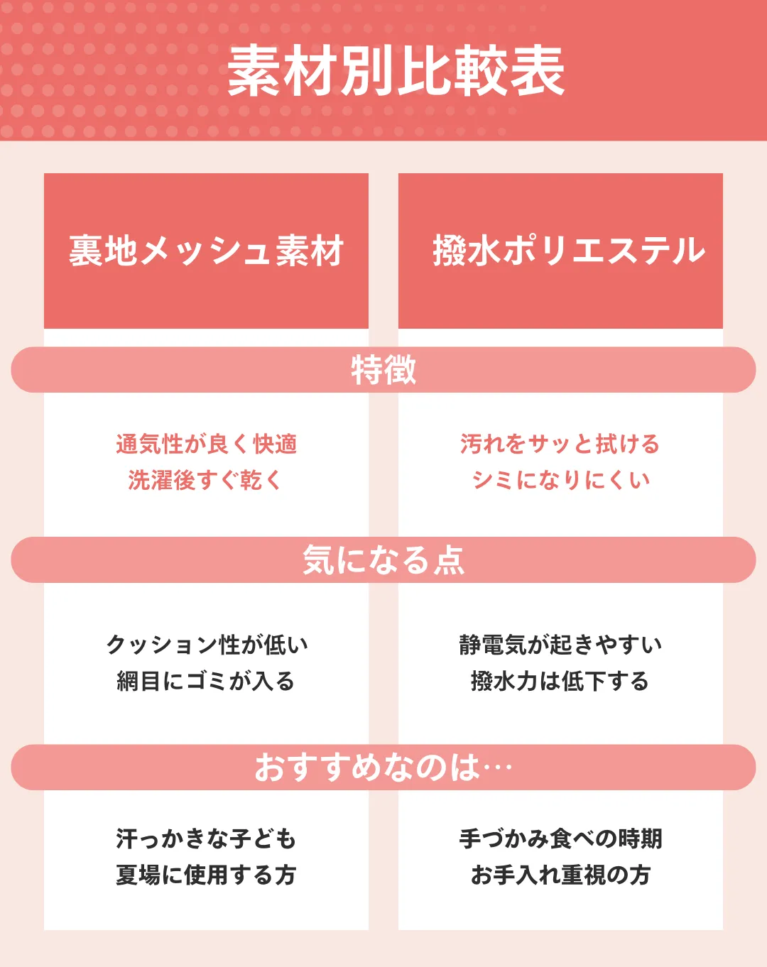 食べこぼしや蒸れに対応できる「素材のメンテナンス性」