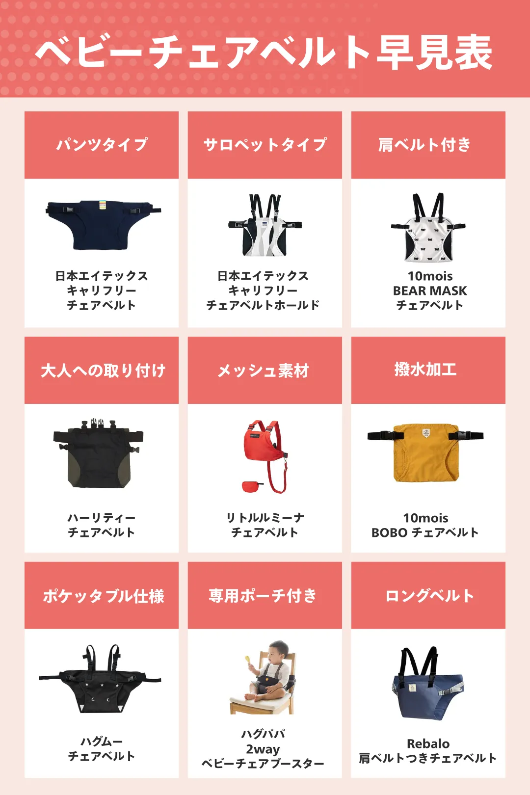 チェアベルト ハグムー | ![]() | Amazon楽天ヤフー | 背面のポケットに本体をまとめて収納できるベルト | 腰がすわった頃~3歳頃まで | サイドベルト約22cm、肩ベルト約40cm、サポートベルト約113cm | (約)200g | ポリエステル | サロペットタイプ | 〇 | 〇 | 〇 | - | 〇 | - | Pink・Blue・Gray・Black |