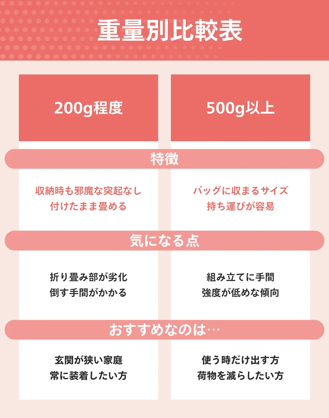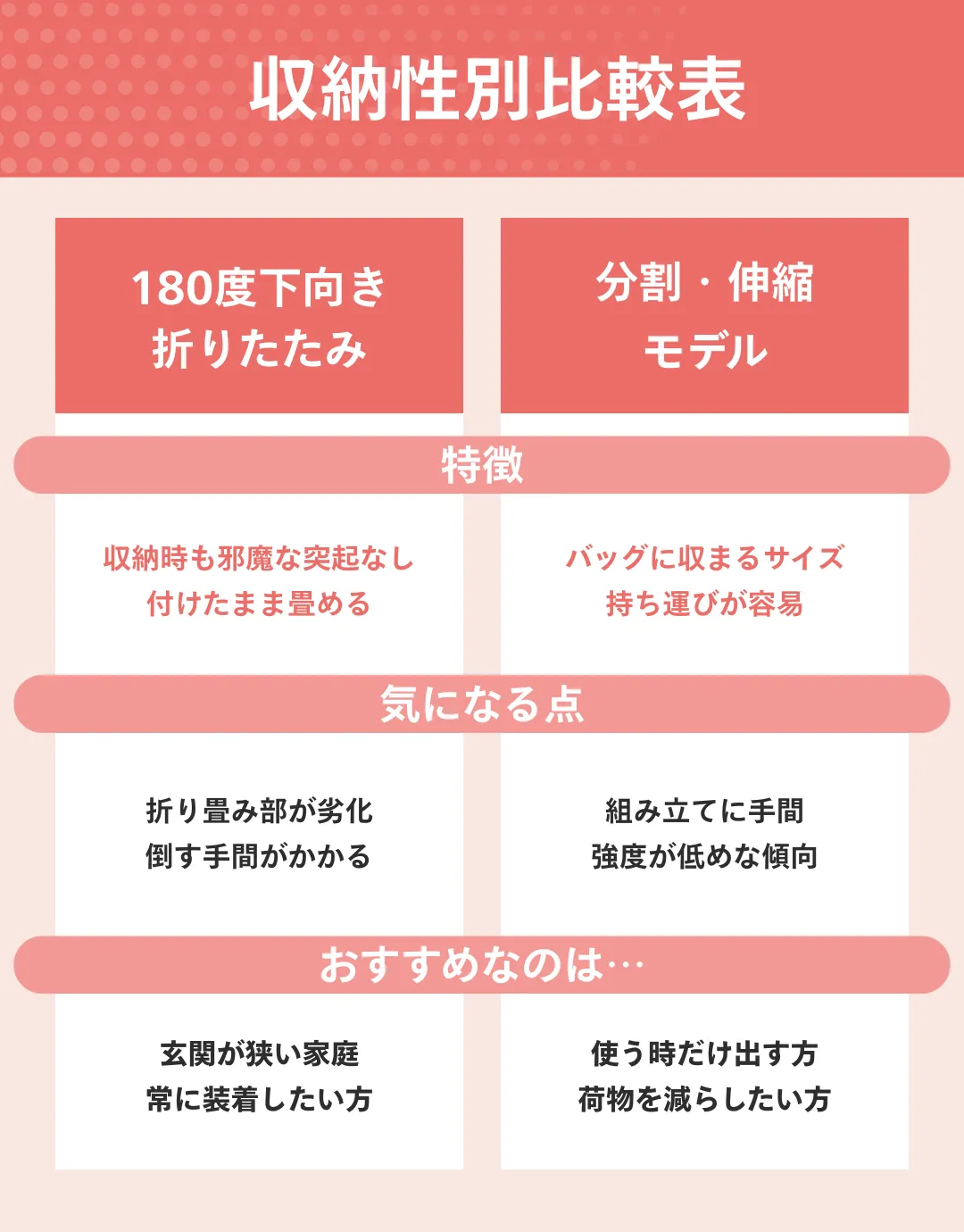 「パパとママの身長差に合わせて高さを変えたい」「狭い玄関に置くので付けたままコンパクトに折りたたみたい」などの使用シーンを明確にすると、選ぶべき商品は自然と絞られてきます。
