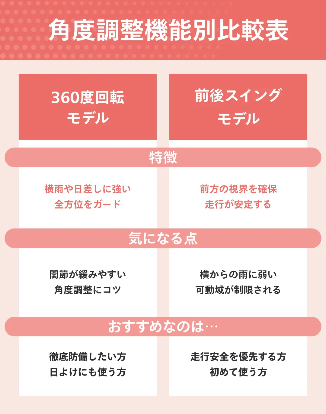 角度調節の自由度よりも、走行時の安定した視界を優先したい方には、前後の角度のみを確実にロックできるスイングモデルが適しています。過度に可動域が広すぎない製品は、ネジを締めた際の保持力が強く、風の抵抗を受けても傘が急に横倒しになるといった事故を防ぎやすい傾向にあります。