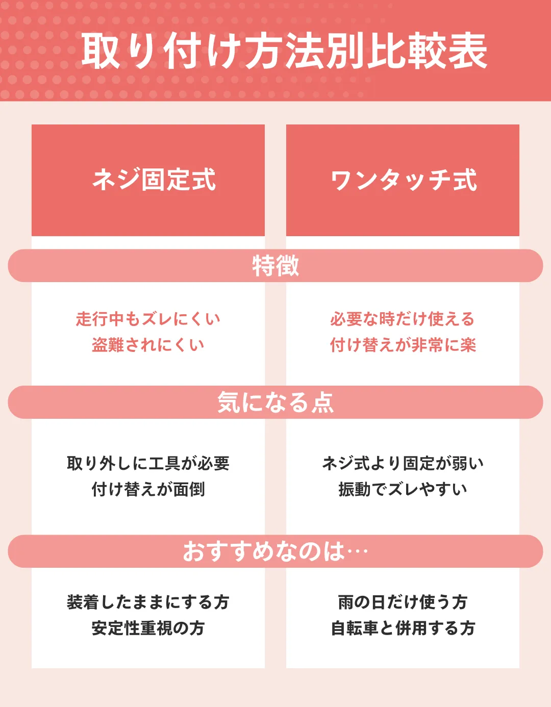 | 取り付け方法 | ネジ式・ワンタッチ式 |
