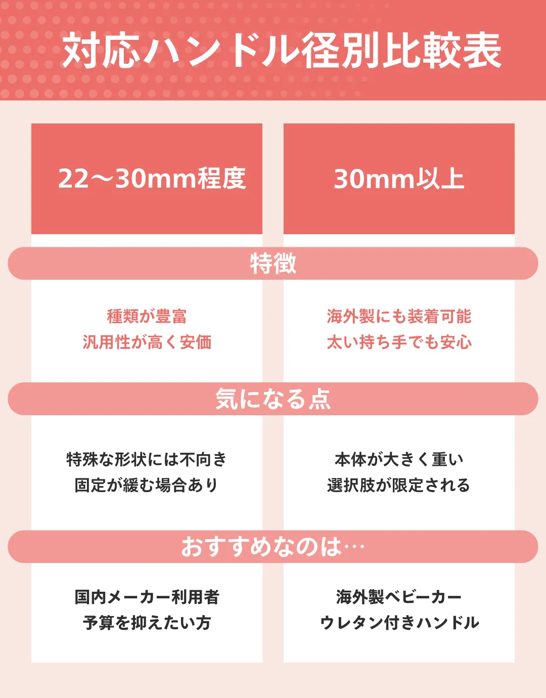 太めのハンドルや海外製ベビーカーには30mm以上のワイド対応モデル