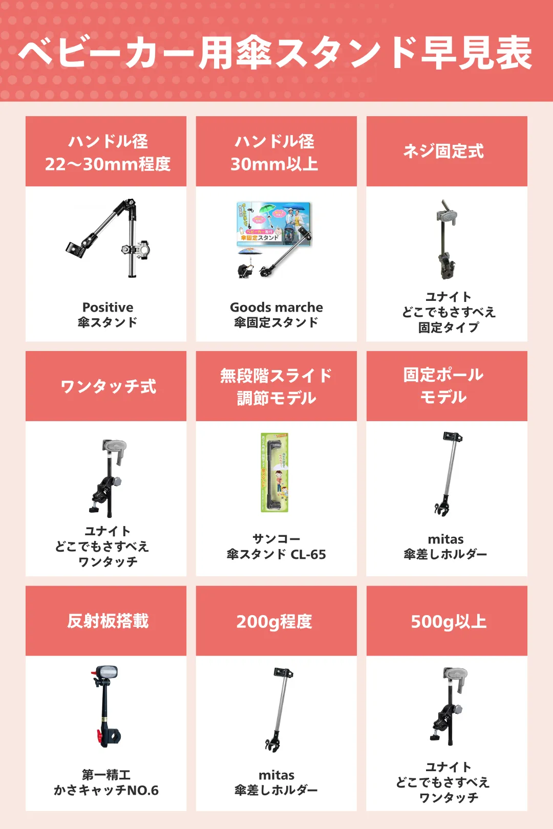 ベビーカー用傘スタンドのおすすめ早見表はこちら