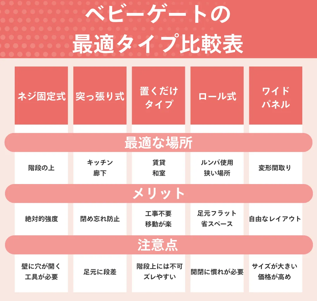 置くだけのベビーゲートは「何を重視するか」を明確にすることで、自分に合った一台が選べます。置くだけのベビーゲート選びでチェックすべきポイントは、ズバリ以下です。