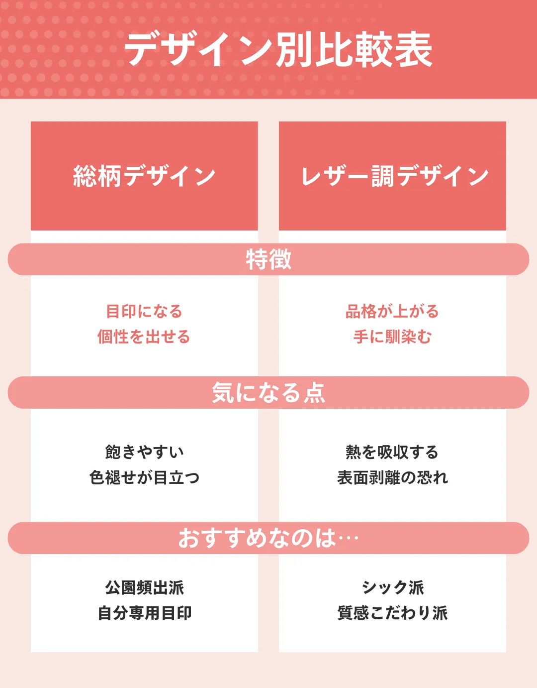 「高級感のあるレザー調でベビーカーを格上げしたい」「公園のベビーカー置き場ですぐに見つけられる目印が欲しい」などの使用シーンを明確にすると、選ぶべき商品は自然と絞られてきます。